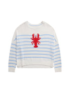 This coastal-inspired knit sweater features a classic horizontal stripe pattern and a relaxed, slightly cropped silhouette with dropped shoulders. The center is highlighted by a vibrant red embroidered lobster graphic, adding a playful and nautical touch to the timeless design. Finished with a comfortable crew neckline and ribbed trim at the cuffs and hem, this soft layer is perfect for seaside strolls or casual weekend outings.