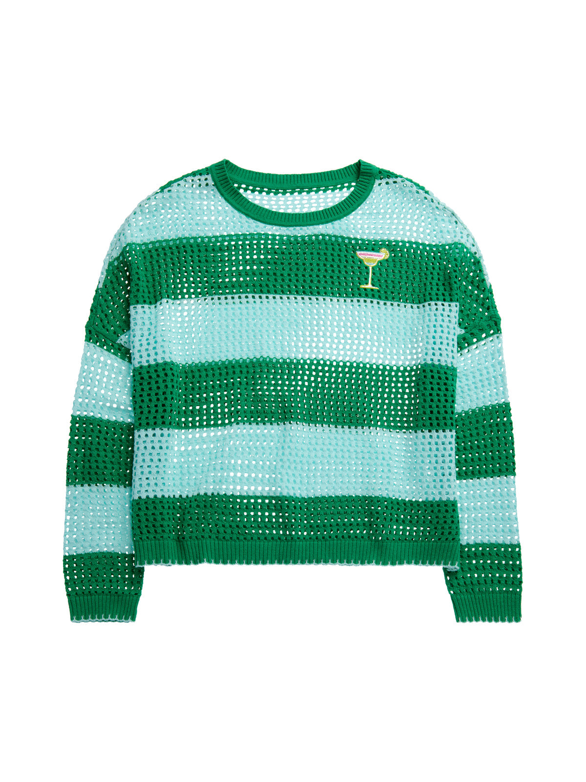 This vibrant long-sleeve sweater features a breezy open-knit construction and a bold striped pattern that is perfect for layering during warmer months. A whimsical embroidered cocktail glass on the chest adds a playful, resort-ready touch to the relaxed silhouette. Designed with a classic crew neckline and comfortable ribbed cuffs, this piece offers a laid-back fit that transitions easily from the beach to a casual brunch. Its lightweight texture and charming detail make it an essential choice for anyone looking to add a pop of personality to their seasonal wardrobe.