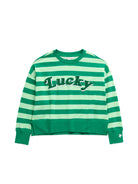 This vibrant striped pullover features a textured "Lucky" chenille patch across the chest for a playful, festive touch. Designed with a modern cropped hem and dropped shoulders, it offers a relaxed yet flattering silhouette perfect for casual styling. High-quality ribbed cuffs, a classic crew neckline, and a small embroidered clover detail on the sleeve complete this comfortable, eye-catching piece.