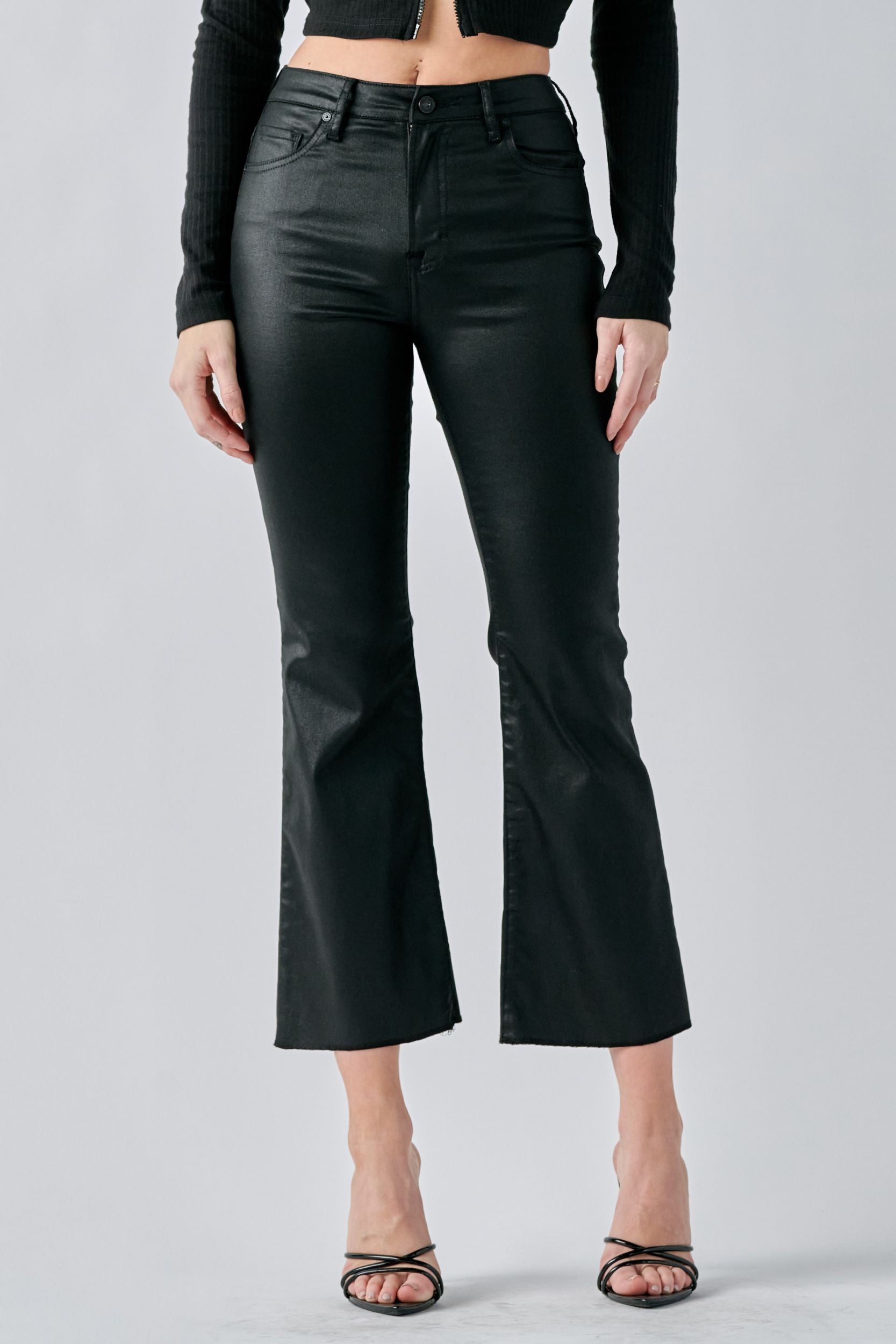 Introducing the Black Coated Cropped Flare, a must-have wardrobe essential for the fashion-forward woman. Made with a sleek black coating, these cropped flares offer a modern and stylish look. Enhance your outfit with these comfortable and versatile pants.