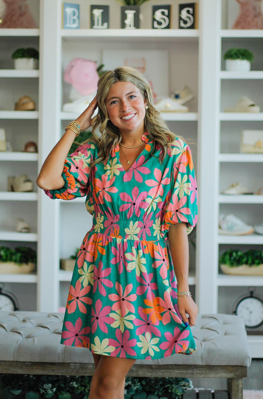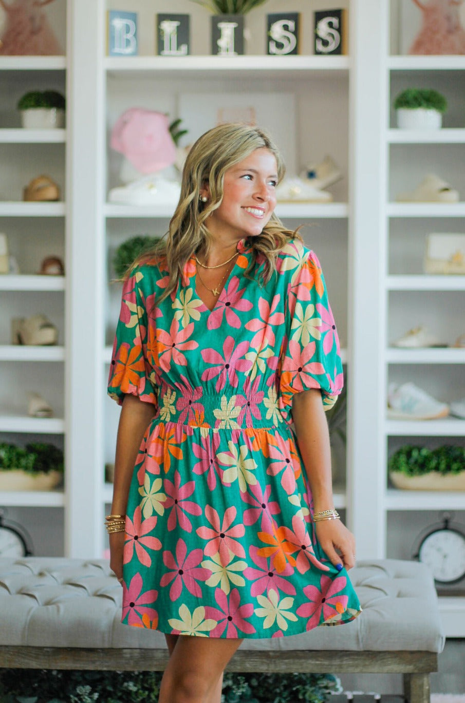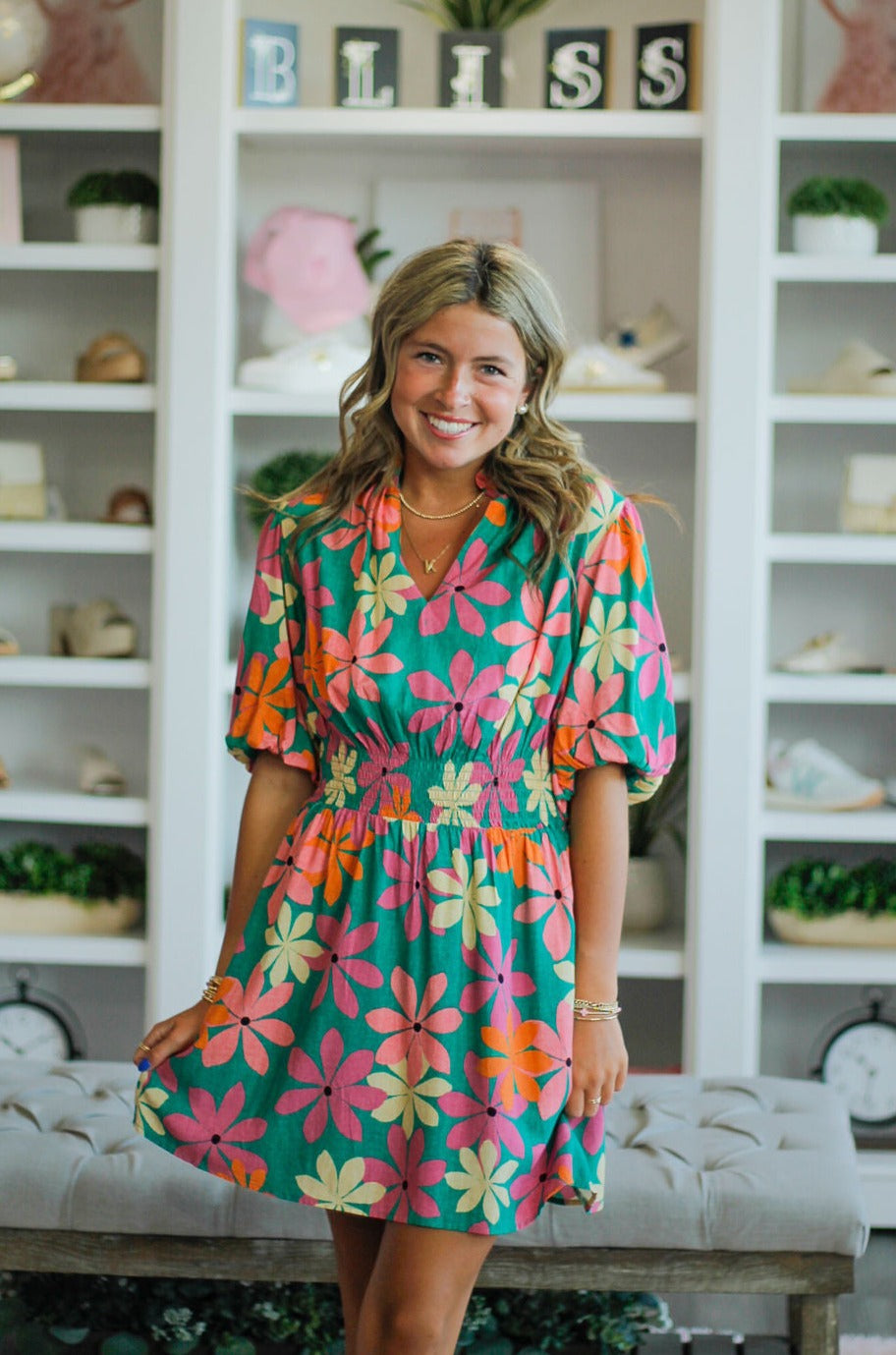 This Blossoms Of Green Dress features a flattering v neck and a beautiful flowered pattern, perfect for any occasion. With its smocked waist and puff sleeves, it provides both style and comfort in one chic package. The short length adds a touch of playfulness, making it the ideal choice for any fashion-forward individual.