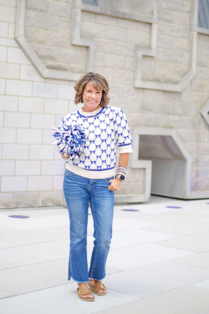 Elevate your wardrobe with our Blue Bow Knit Short Sleeve Sweater. Expertly crafted with a charming blue bow pattern on a cream knit, this top is perfect for adding a touch of whimsy to any look. Versatile, cute, and sure to be a best seller.