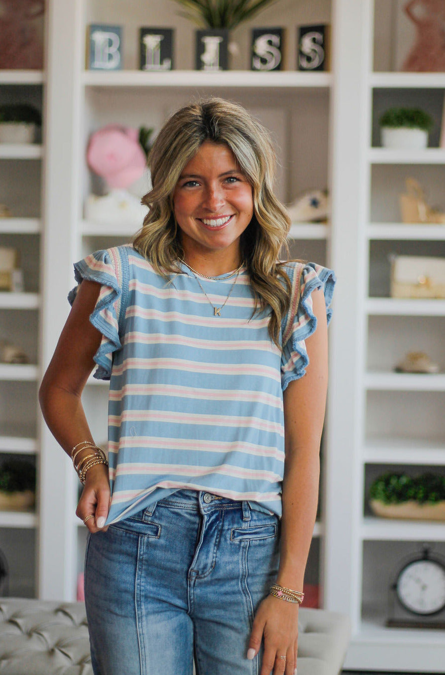 As a product expert, I highly recommend this stylish blue and pink and white striped top. Its flutter ruffle sleeves and high-quality material make it not only super cute, but also a great addition to any wardrobe. Perfect for any occasion, this top is a must-have for fashion-forward individuals.