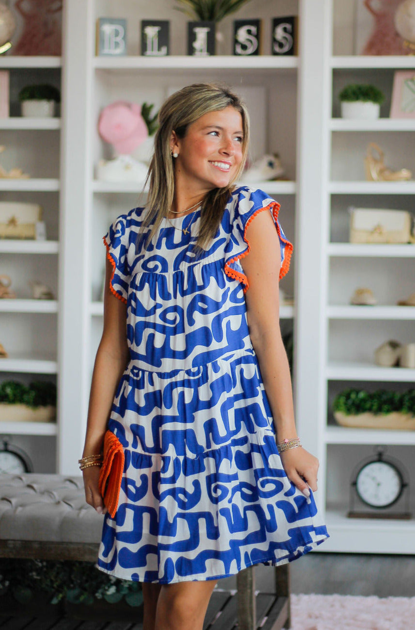 Elevate your style with our Blue With Pop Of Orange Dress. The flutter sleeve adds a touch of elegance while the orange little ball tassels on the sleeve bring a playful twist. The blue and white abstract print makes it a best seller, perfect for any occasion.