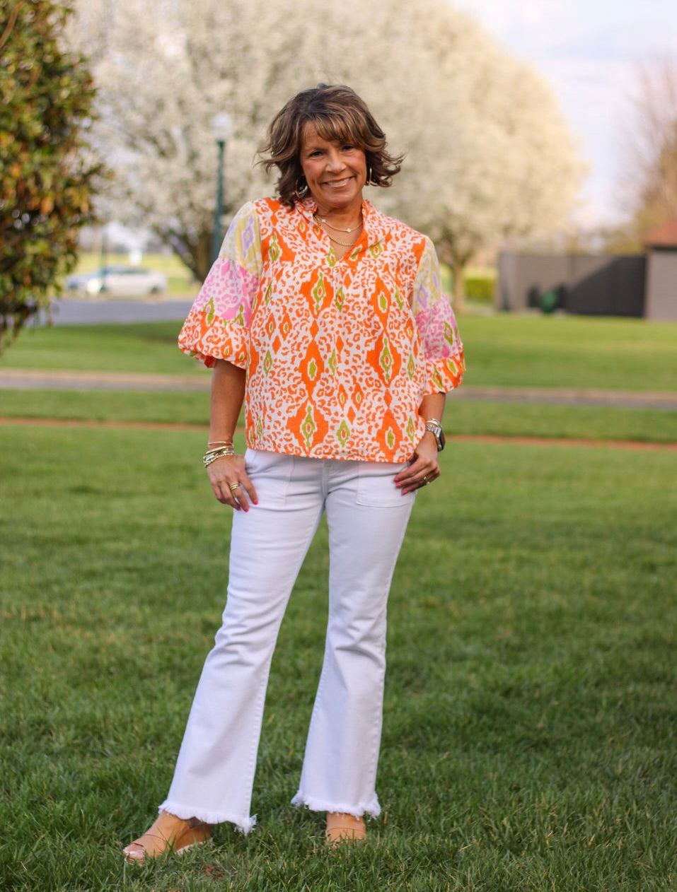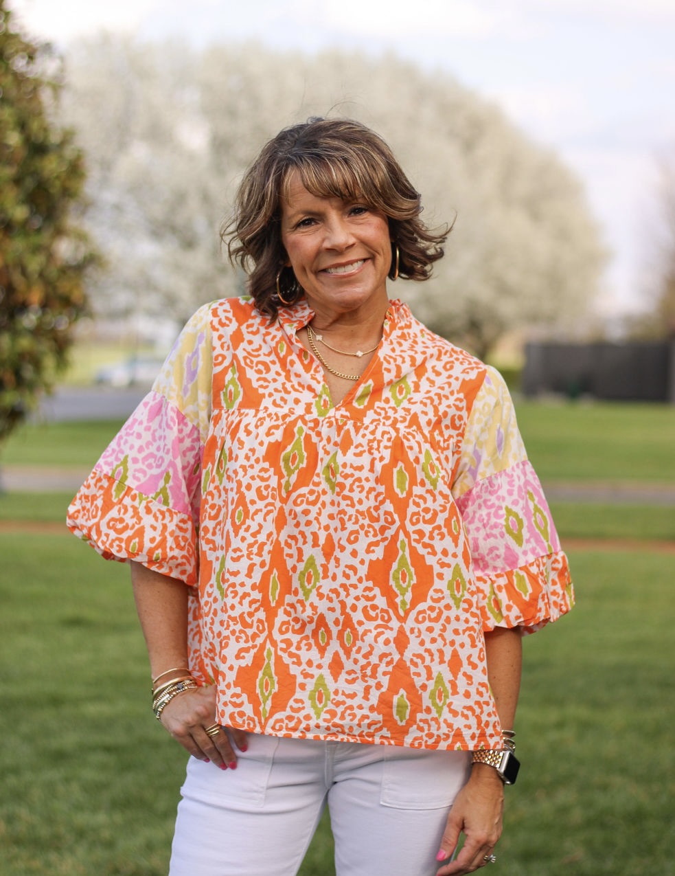 This Bright and Sunny Puff Sleeve Top adds a touch of fun and style to your wardrobe with its vibrant orange and yellow animal print. The puff sleeves and V-neck design provide a flattering and fashionable look. Elevate your outfit and brighten your day with this unique top.
