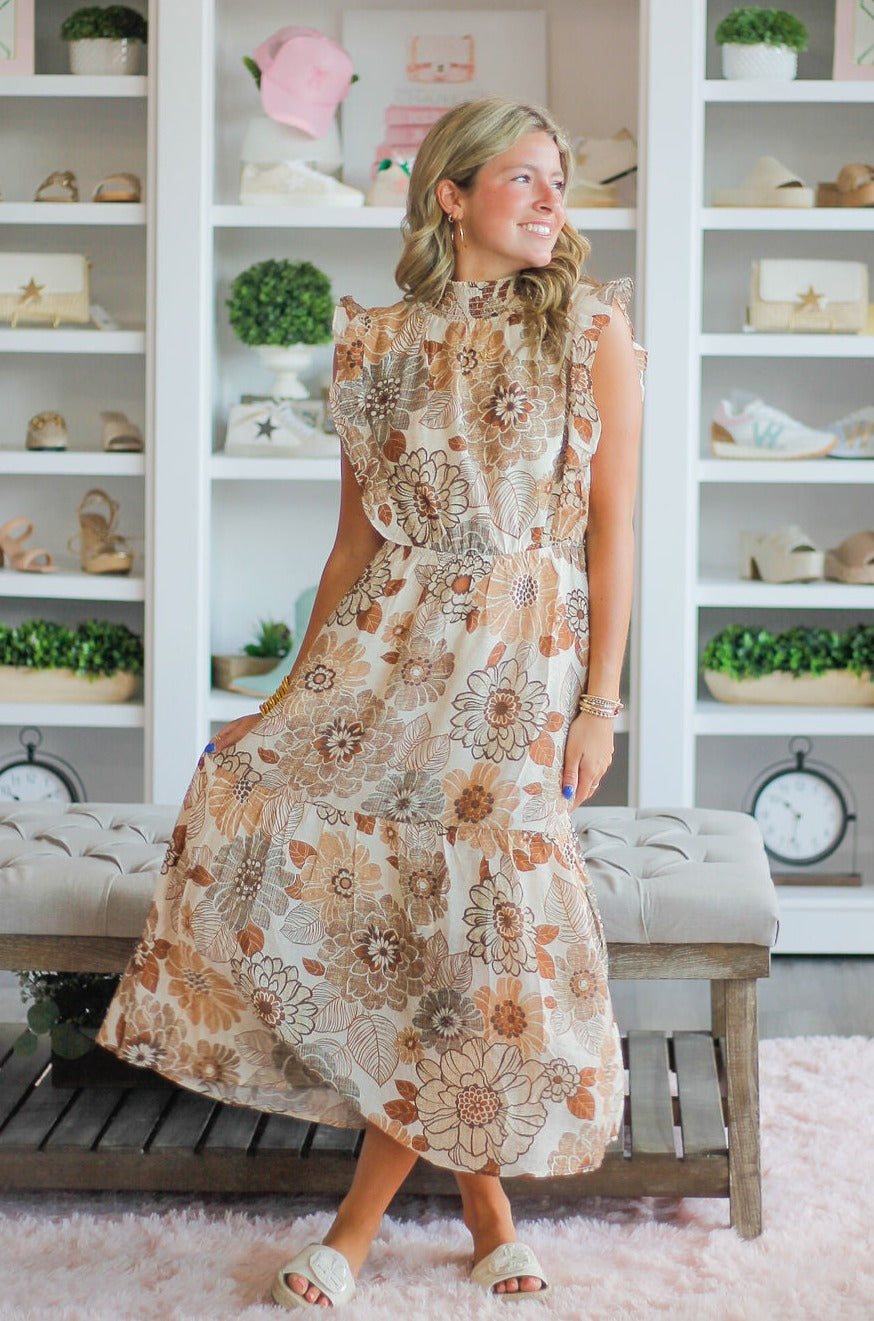 Get ready to bloom in this Brown Floral Midi Dress! With a playful tiered design and flowy midi length, you'll feel effortlessly elegant. The high neck and smocked ruffle details add a touch of fun, while the cinched waist flatters your figure. Perfect for any occasion, this dress is a must-have for every wardrobe!
