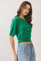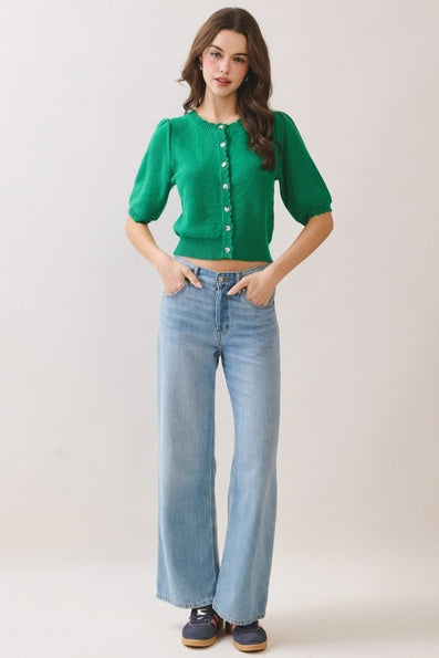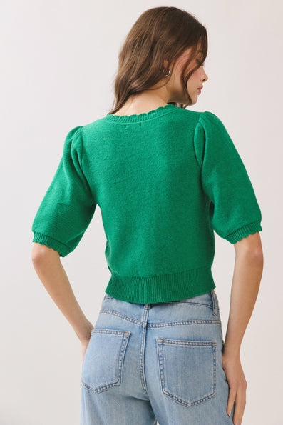 Add a touch of timeless charm to your knitwear collection with this short-sleeve cardigan. Featuring a cropped silhouette and subtle puff sleeves, it brings a vintage-inspired look that feels fresh and modern. Perfect for layering over dresses or pairing with high-waisted denim, this cardigan offers an effortless, polished ensemble. The classic round neckline with scalloped edging, functional button-front closure with contrasting buttons, and ribbed cuffs create a feminine shape while ensuring comfort and structure.