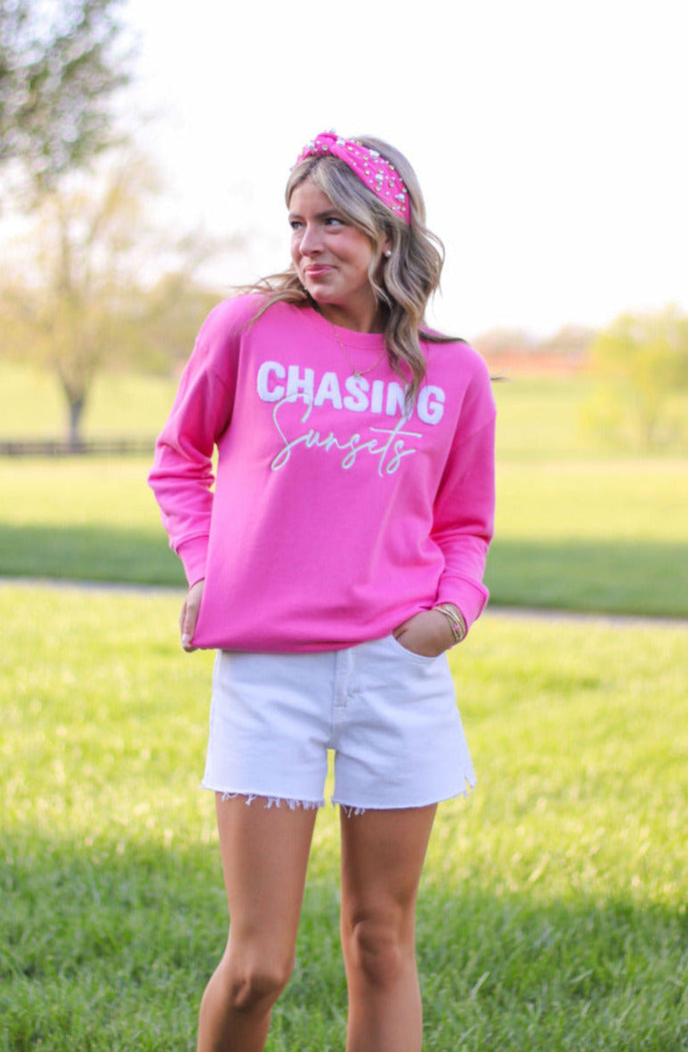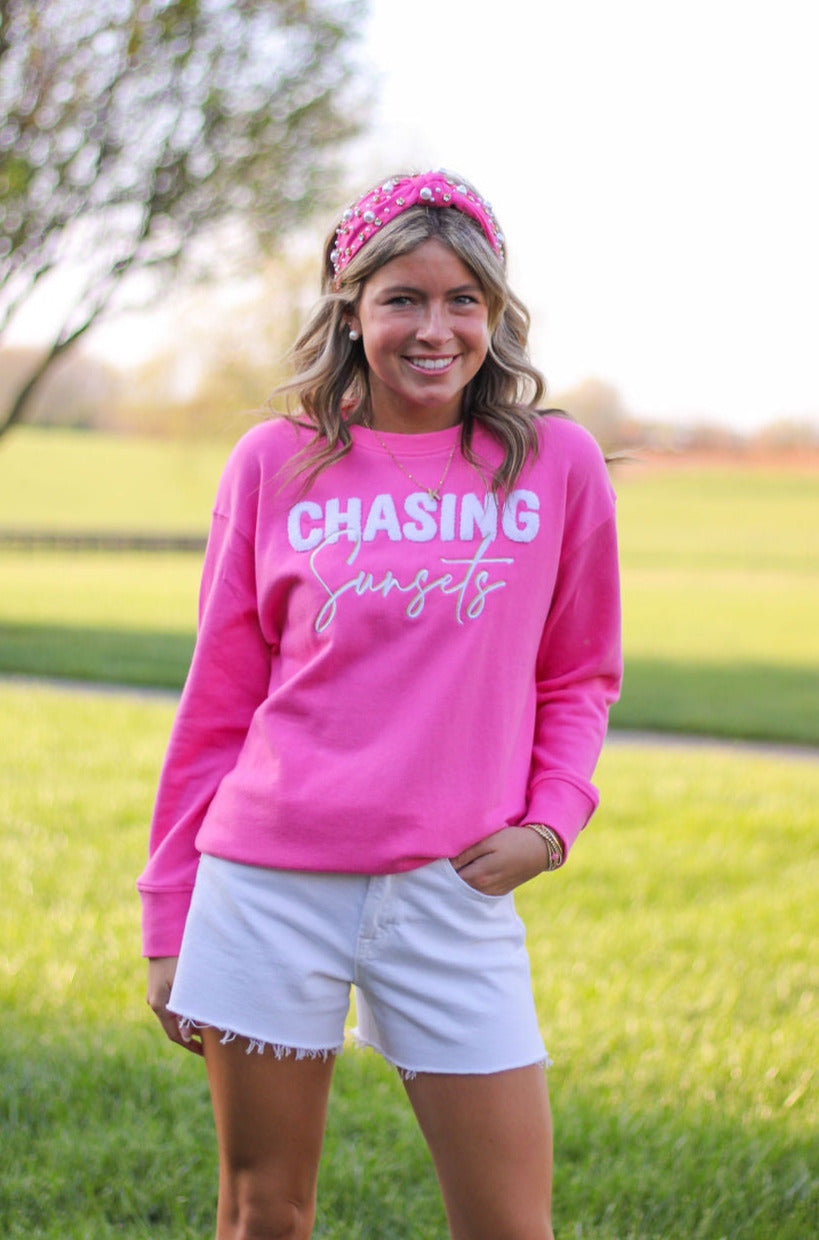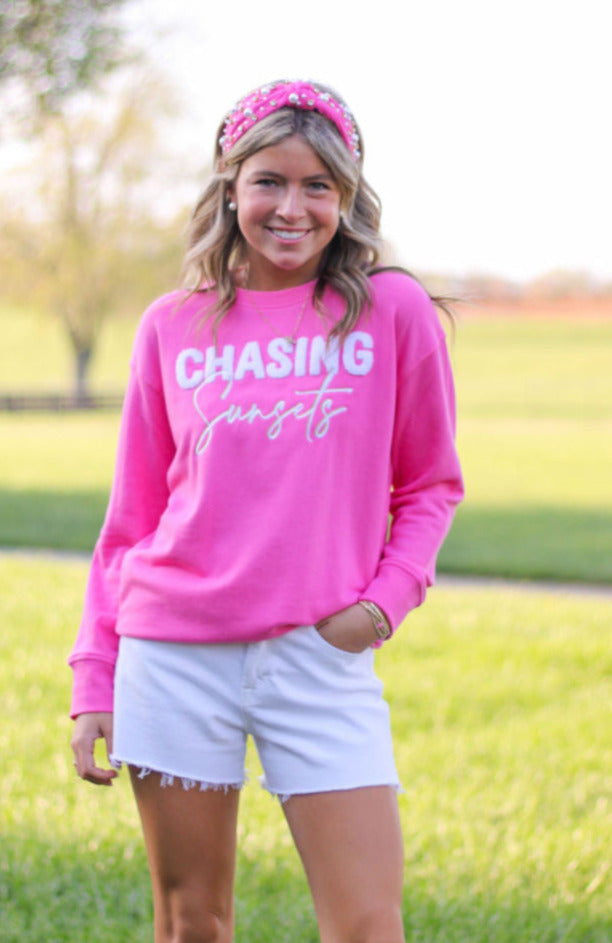 Introducing our "Chasing Sunsets" Sweatshirts - the perfect addition to your comfortable wardrobe! Made with a lightweight cotton blend, it's great for lounging at home or chasing sunsets. Soft toothbrush embroidery and gold lurex stitching add unique details. Get yours now and relax in style.