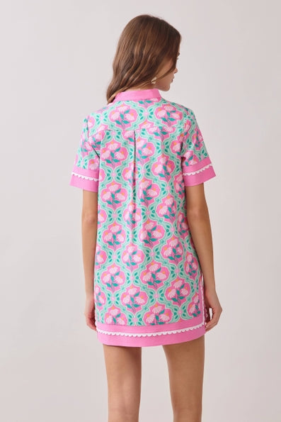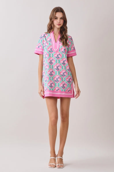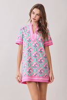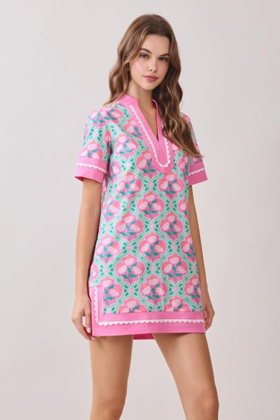 Lightweight and easy to wear, this shift silhouette is finished with contrast borders and delicate scalloped trim for a polished yet playful look. The split neckline and short sleeves offer breathable comfort, making it ideal for warm days and effortless styling. A relaxed fit ensures all-day ease, while the refined detailing adds boutique-worthy charm. Perfect for casual outings, vacations, or daytime events.