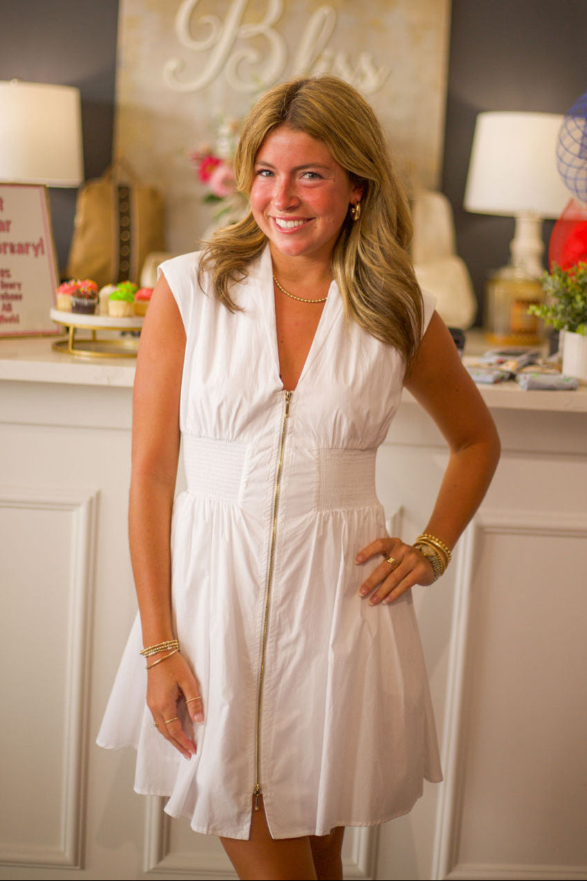 The Cory Dress by Reset is the perfect combination of chic and playful. The white dress features a gold zipper front, adding a touch of glamour. The v-neck collar and shoulder pads give a unique twist to this short dress, making it a stunning and versatile piece for any occasion.