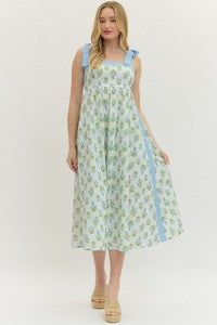 This charming midi dress features a playful floral pattern and adjustable tie-shoulder straps, adding a touch of femininity and comfort. The lightweight fabric offers breathability, making it perfect for warm-weather days. Ideal for casual outings, picnics, or a day at the beach, it combines style and ease effortlessly. Pair with sandals or wedges for a chic, relaxed look.