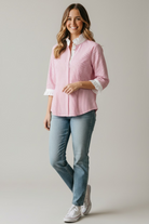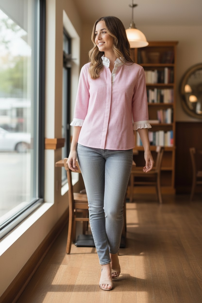 Make a refined statement with this polished blouse, designed to elevate your everyday wardrobe. Featuring a cropped silhouette, it offers a modern, flattering fit that pairs effortlessly with both tailored and casual pieces. Delicate details like a standing ruffle collar, shell buttons, and 3/4 sleeves with ruffle accents add a touch of feminine sophistication. Crafted from a durable, lightweight blend, it ensures comfort, easy care, and lasting style.