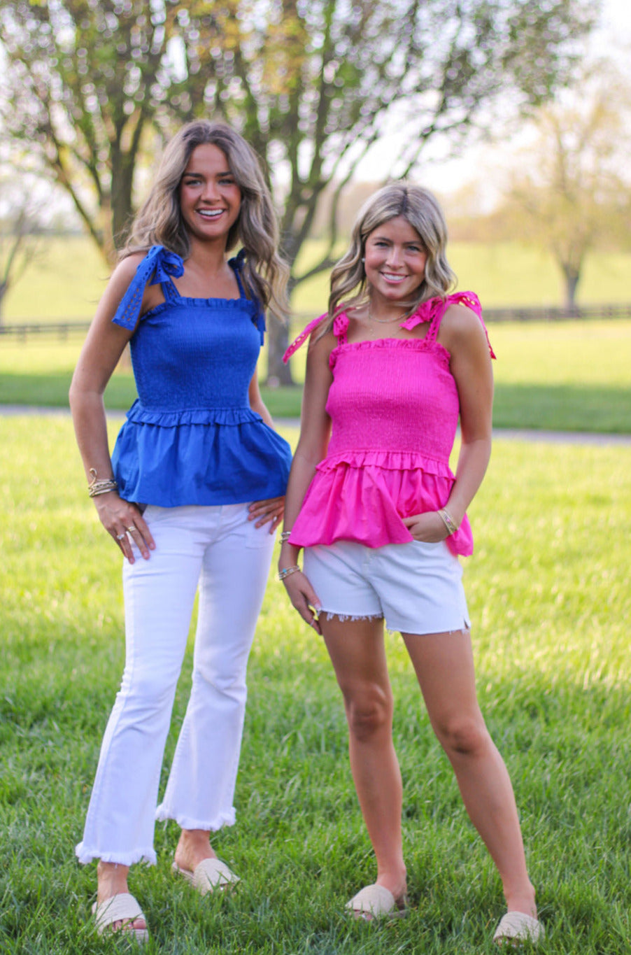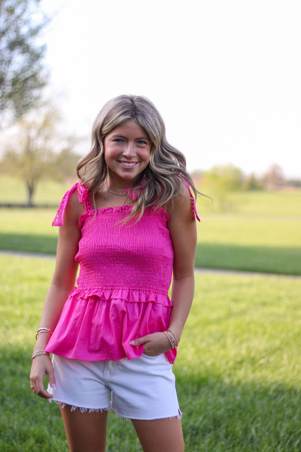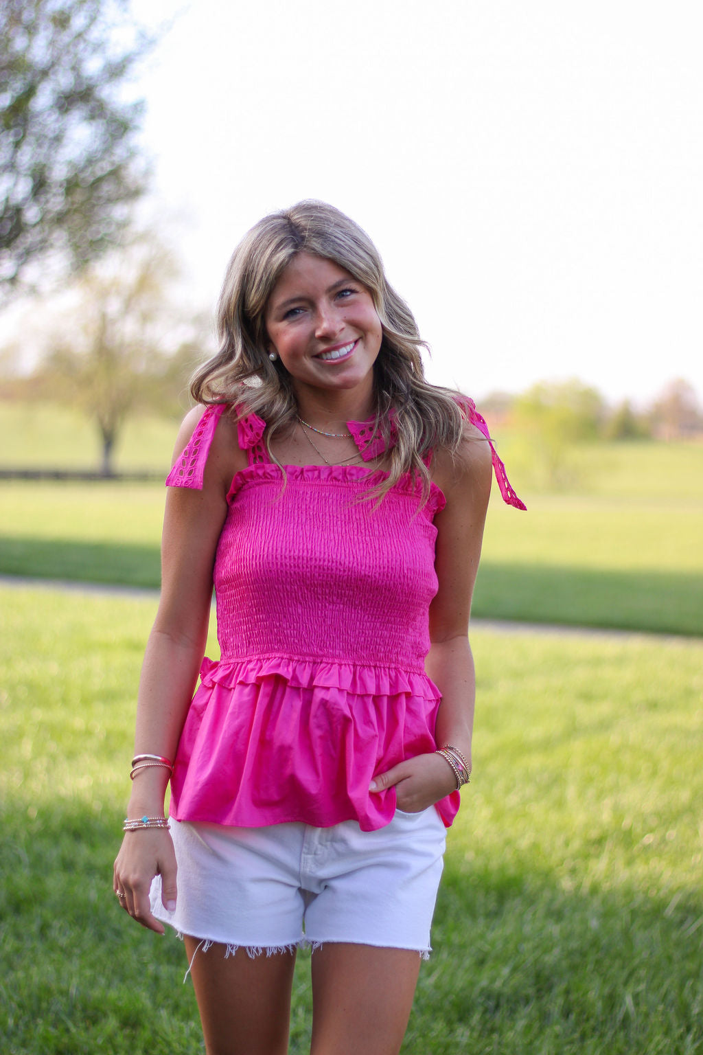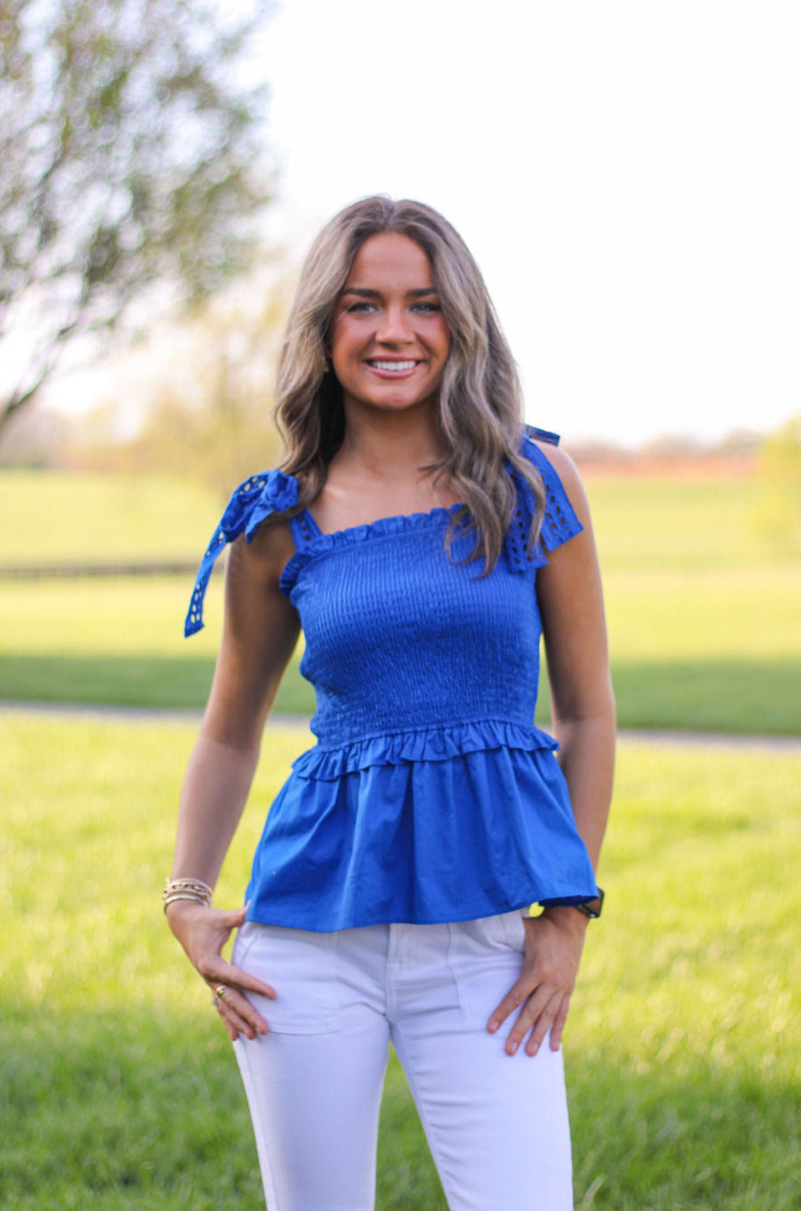 This EYELET LACE SHOULDER PEPLUM TOP is made from high-quality POPLIN material and features a stylish BOW SHOULDER design. The SMOCKED TOP and RUFFLE DETAIL add feminine touches to this top. Perfect for any occasion, it combines comfort and style effortlessly.