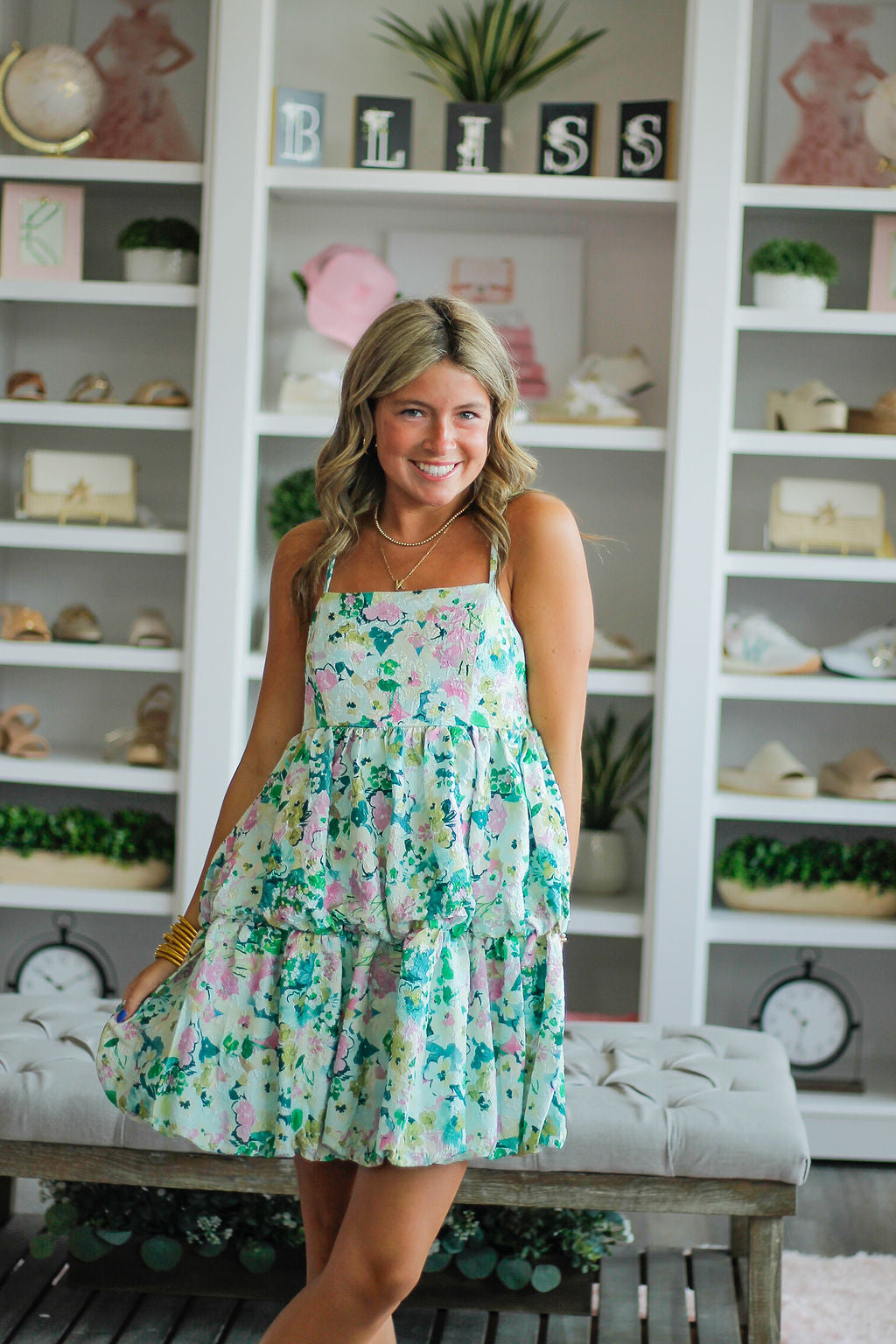 This flowy floral dress is perfect for a day out! Featuring a trendy spaghetti strap design, a flattering tiered bubble hem, and a smocked back for ultimate comfort. Be stylish and playful wherever you go!