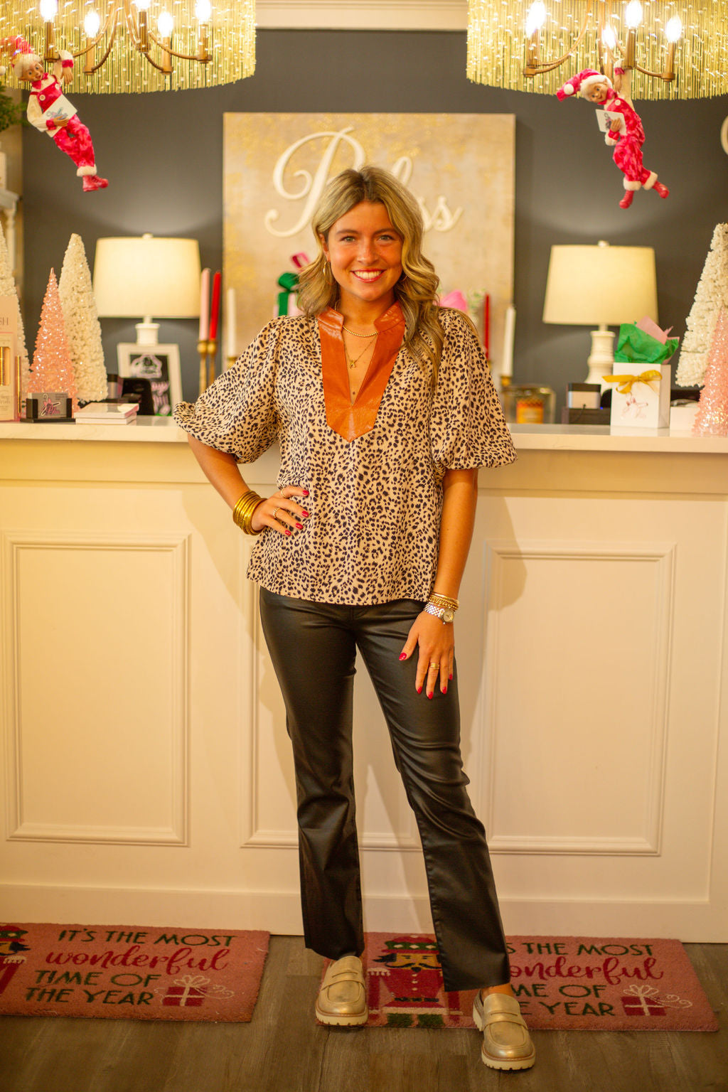 Step out in style with the THML Puff Sleeve Print Top. Featuring a fierce leopard print and a faux leather collar, this top is sure to turn heads. The playful puff sleeves add a touch of fun and flair to any outfit. Perfect for those who like to make a statement while keeping it classy. (Rawr!)