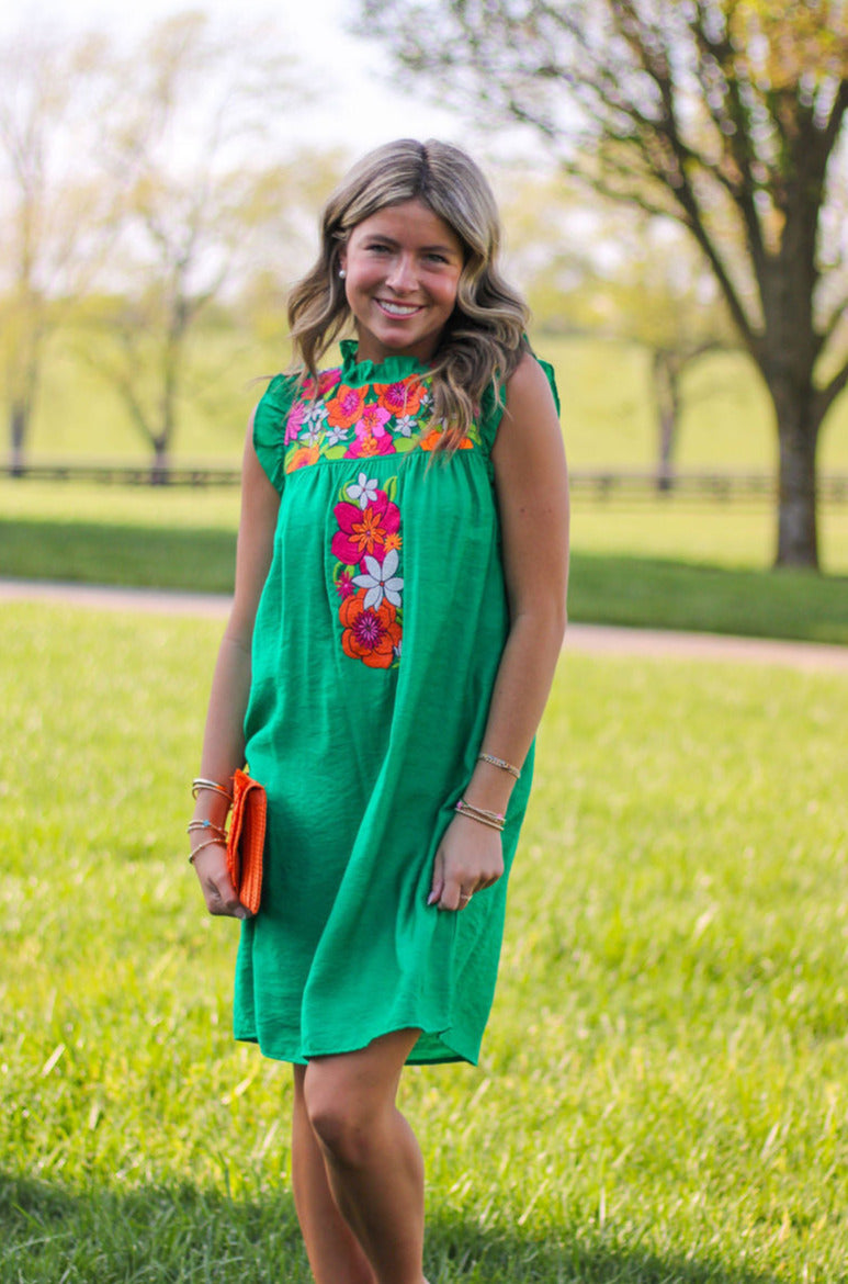 This elegant Green Garden Dress features flutter sleeves and intricate embroidery of colorful flowers, adding a touch of femininity to its short and versatile design. Perfect for any occasion, this dress is a must-have for the fashion-forward woman.