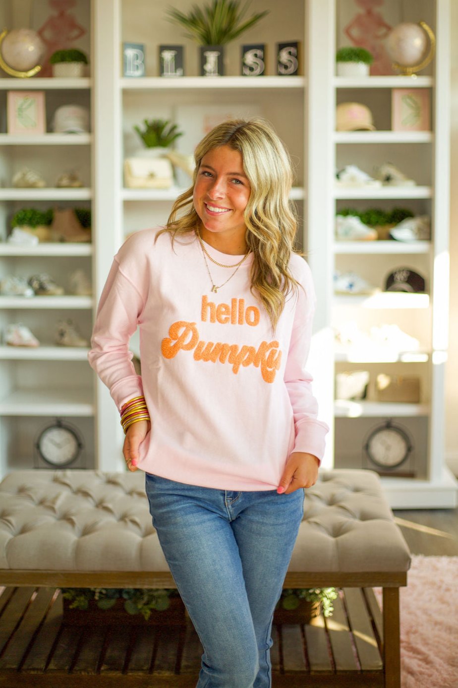 Introducing the Hello Pumpkin Sweatshirt, perfect for cooler weather. This sweatshirt features a textured print of "hello pumpkin" in a vibrant orange color on a soft, comfortable purple and pink base. Stay on-trend and cozy with this must-have piece.