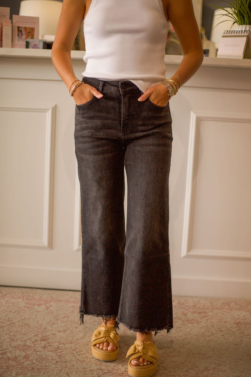 Hit new heights in style with our High Rise Wideleg Jeans! These light blue denim pants feature a playful raw hem and a flattering high rise fit. Add a touch of quirk to your wardrobe with this unique and trendy pair. Light Denim in color