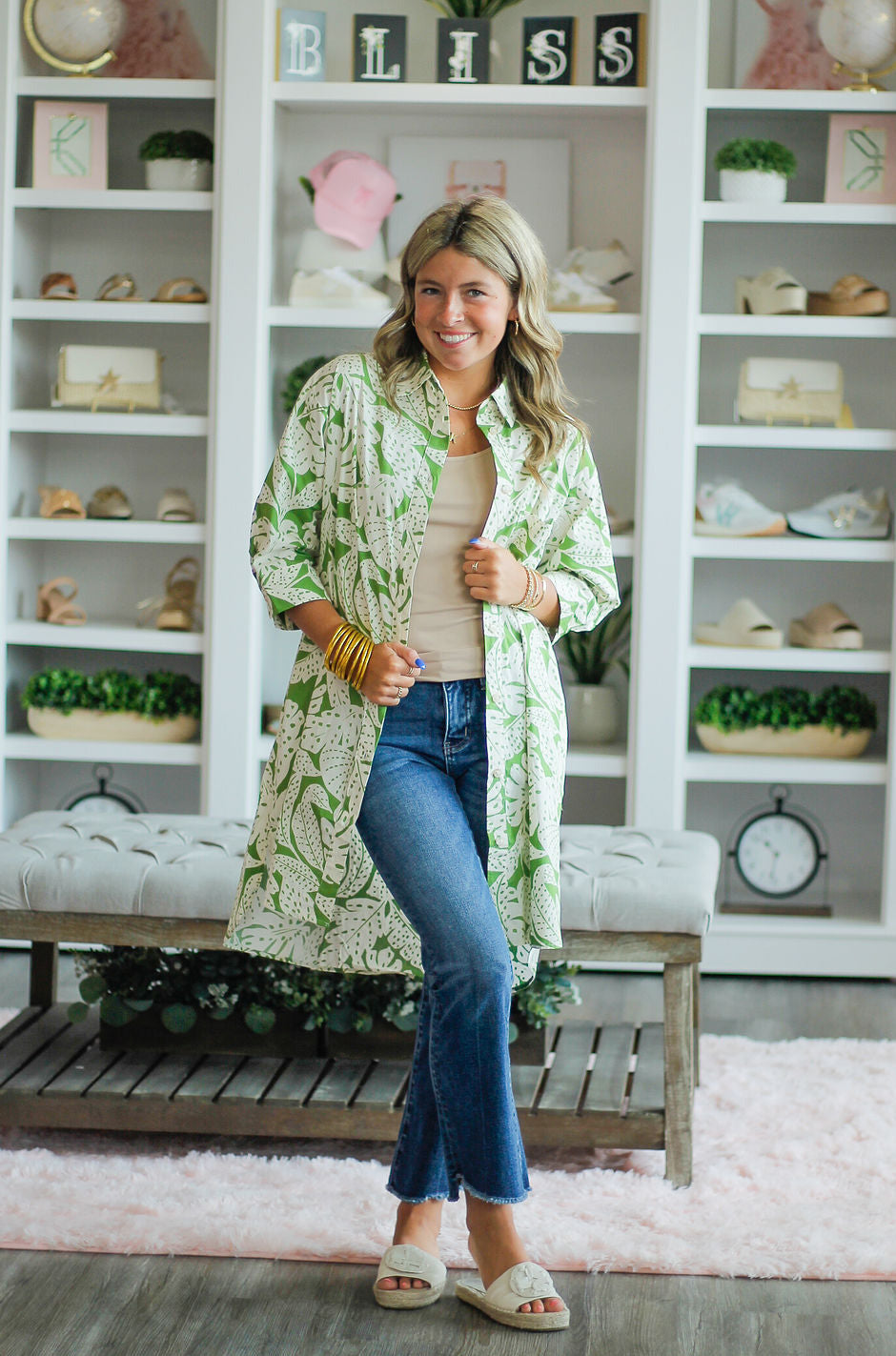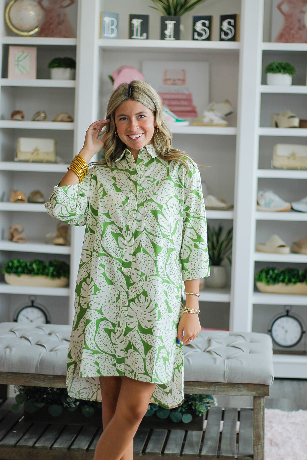 Unleash your inner island vibes with the Karlie Ibiza Palm Shirt Dress. Featuring a playful green and white leaf print, this oversized button down short sleeve dress is perfect for a day at the beach or a tropical getaway. Embrace the summertime fun in style!
