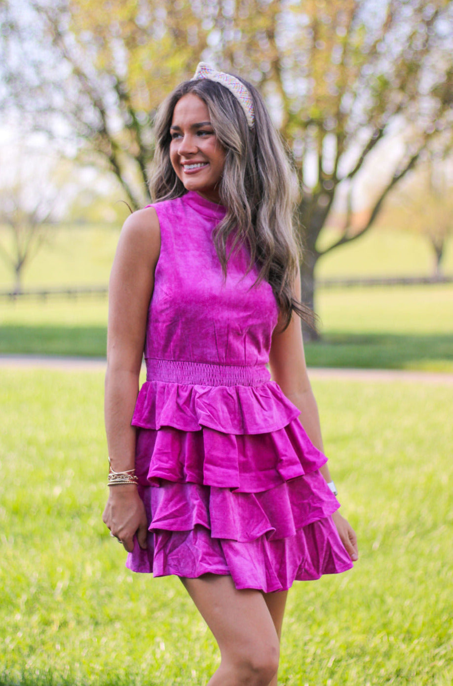 Upgrade your wardrobe with our Magenta Ruffle Dress. This mock neck, sleeveless dress features a smocked waist for a flattering fit, and a tiered ruffled skirt for a touch of femininity. Easily slip into this dress with the concealed back zipper. Perfect for any occasion.