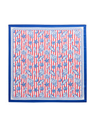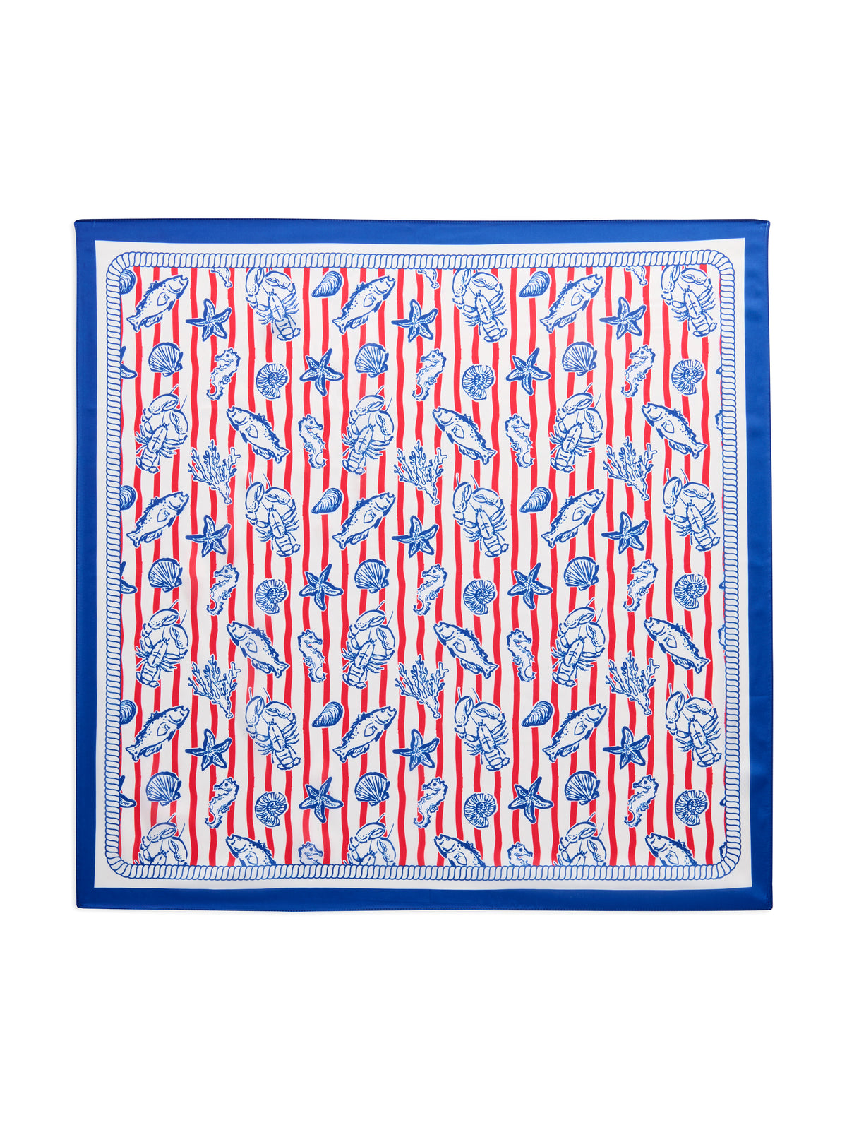 This scarf features a playful nautical design, with blue illustrations of lobsters, starfish, seashells, and fish set against vibrant red and white stripes. The blue border adds a polished finish to the fun, beach-inspired theme. This scarf is perfect for adding a coastal touch to your outfit, making it an ideal accessory for summer or vacation looks. Its colorful and whimsical design brings an effortless touch of charm and style to any look.
