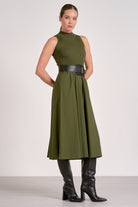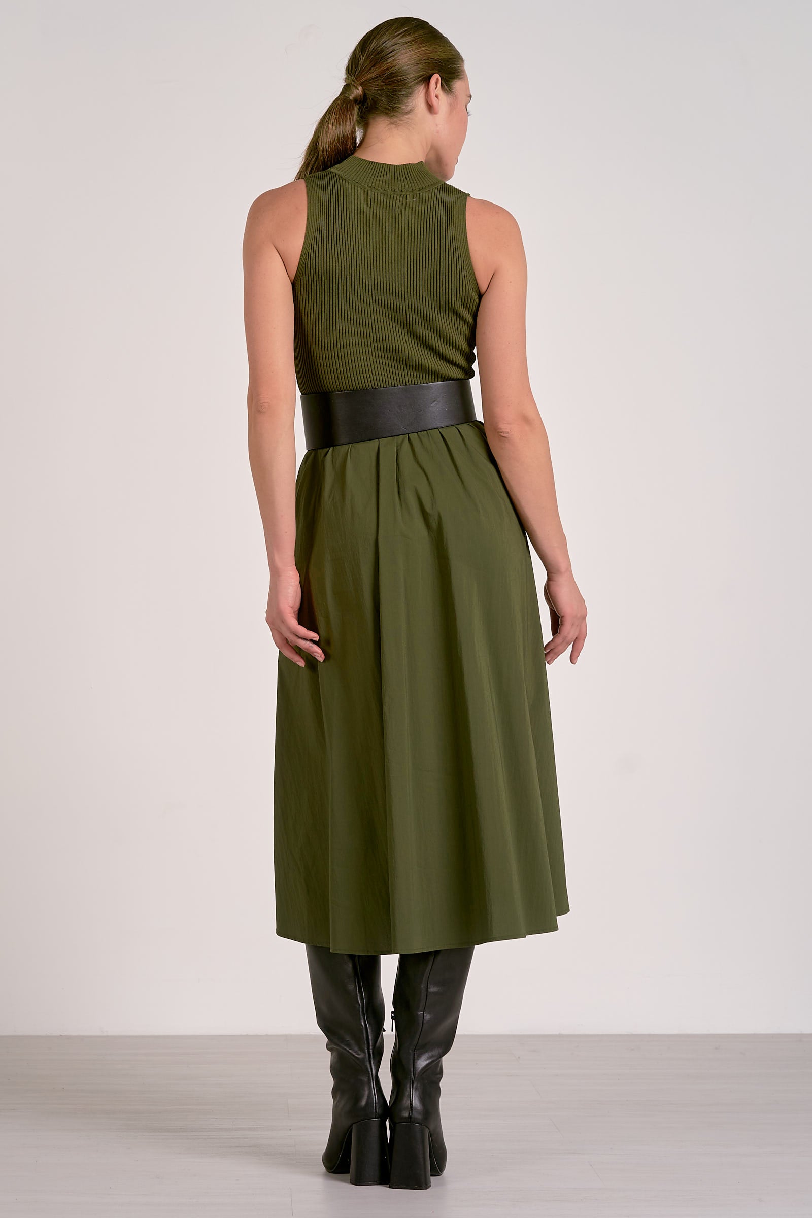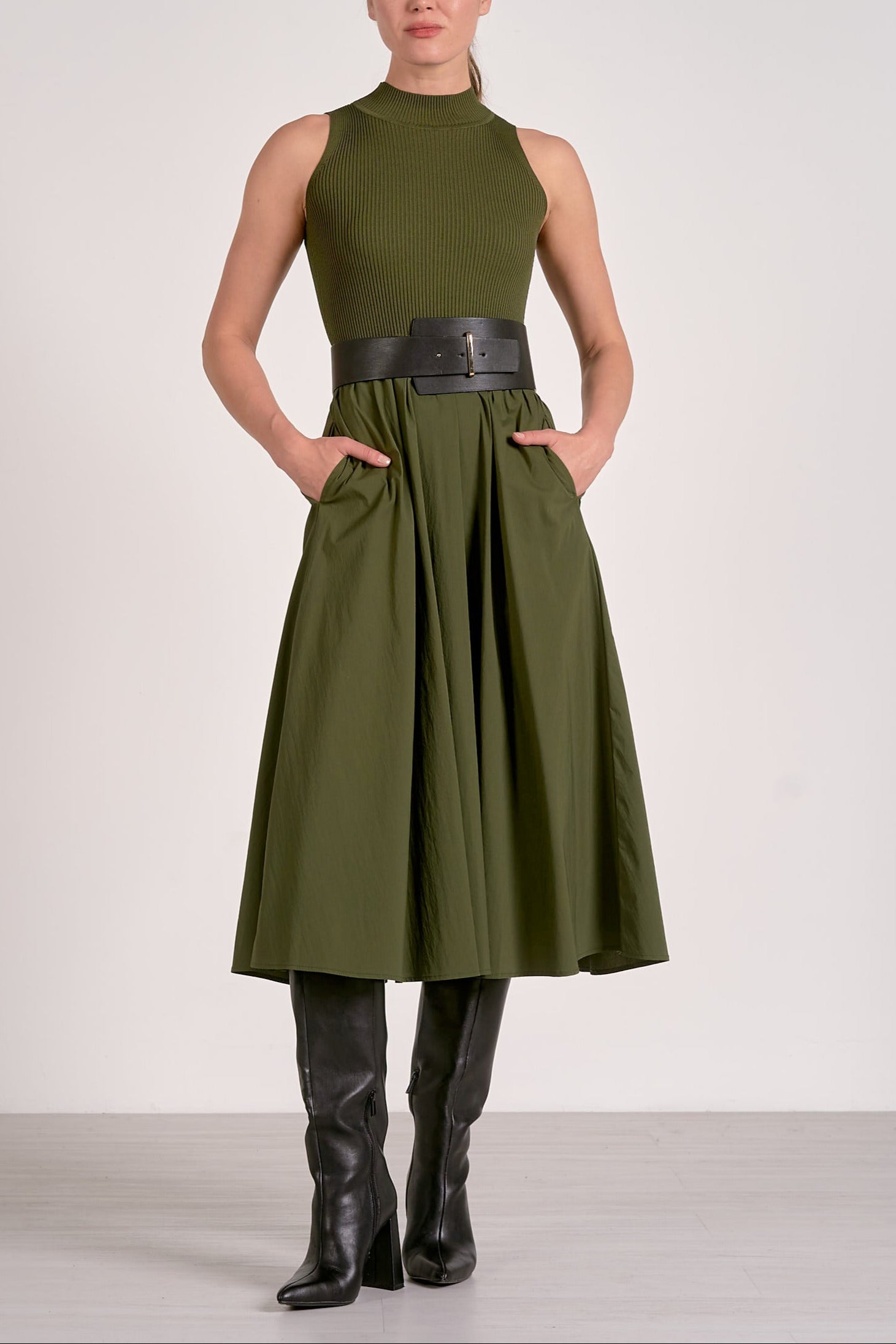 This maxi dress features a sleek mock neckline and sleeveless cut, blending modern elegance with timeless style. The fitted ribbed bodice contrasts beautifully with the flowing skirt, creating a flattering silhouette. A cinched waist enhances the shape, adding definition while maintaining comfort. Perfect for both daywear and evening occasions, it offers sophistication with effortless ease.