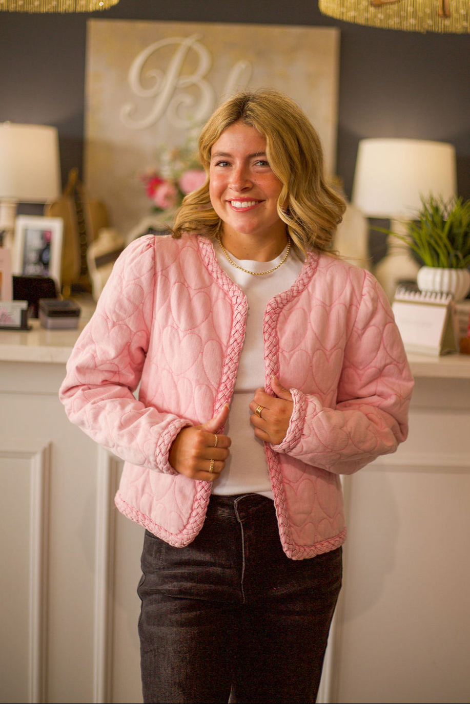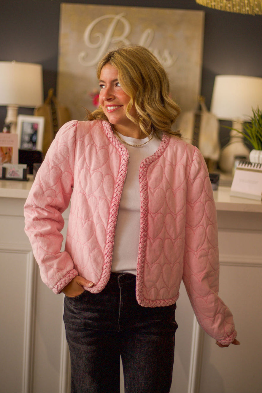 Get ready to turn heads with the Novelty Heart Stitch Denim Jacket by Karlie. With its unique quilted design and braided detailing, this jacket is sure to add a touch of personality to any outfit. Perfect for those who like to stand out in a playful and fun way.
