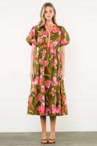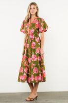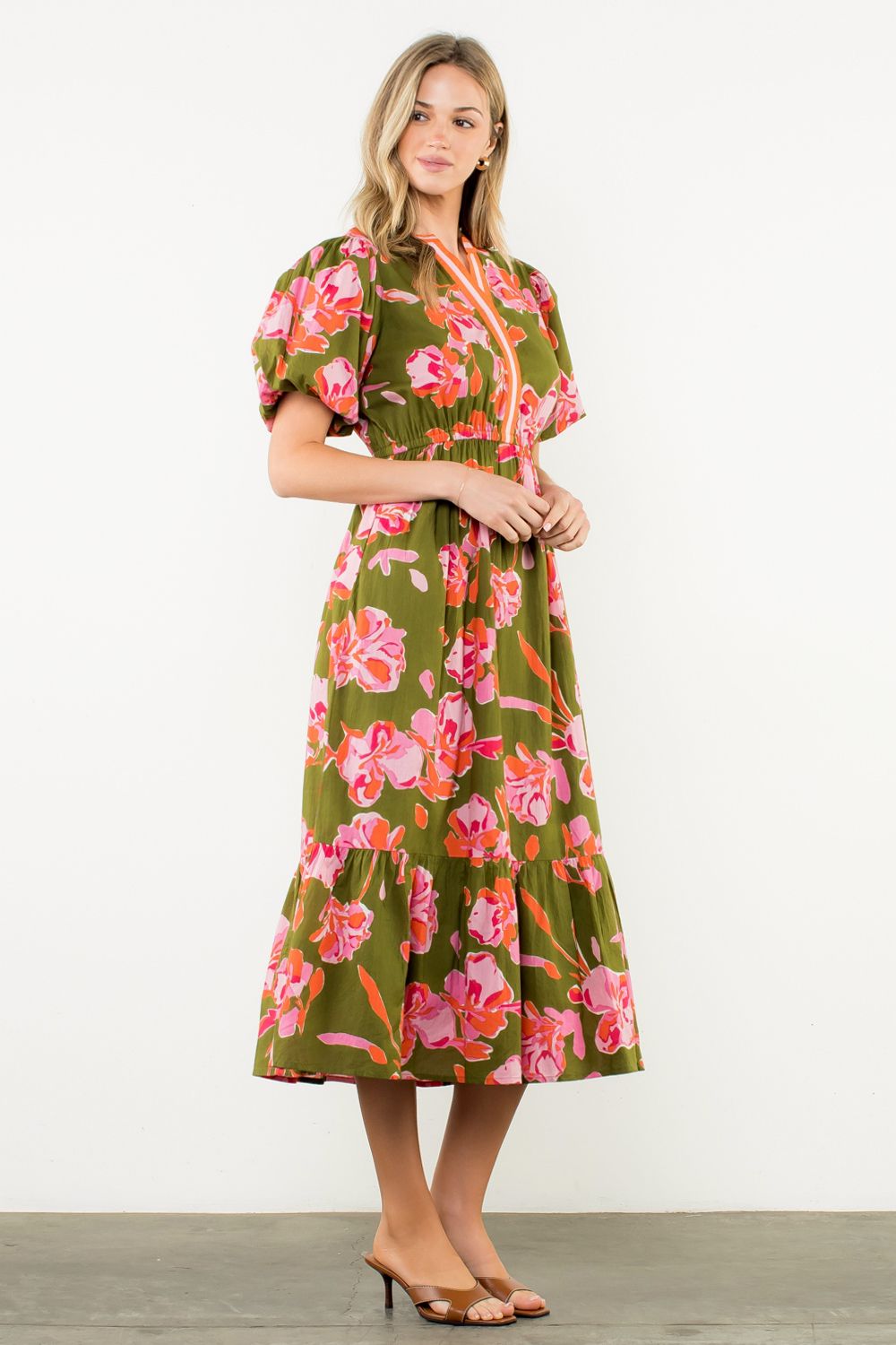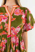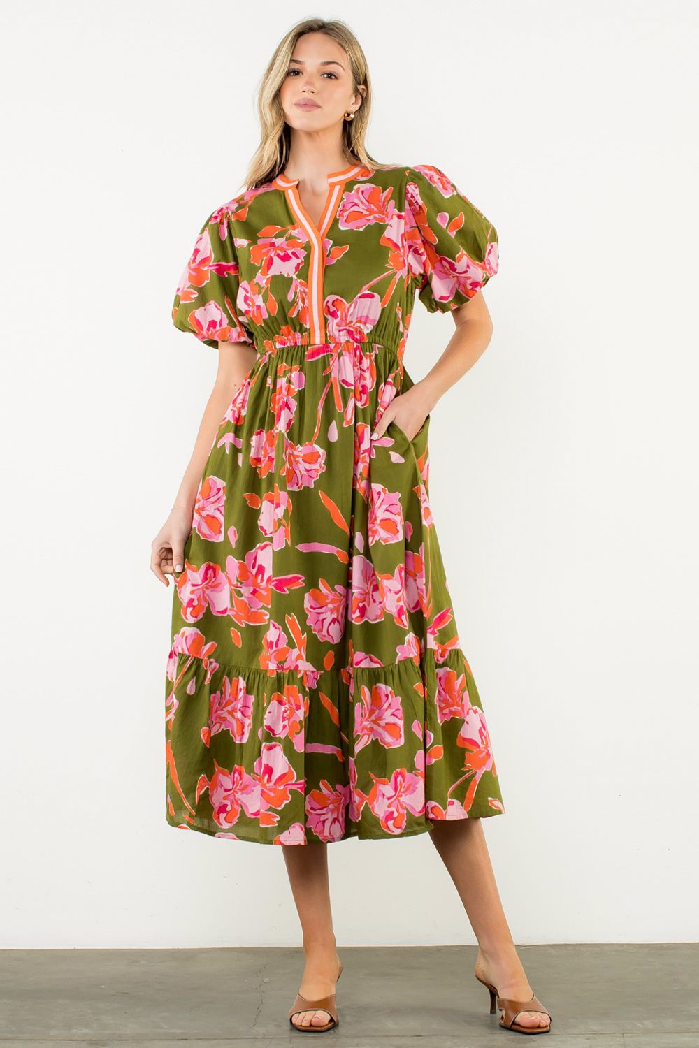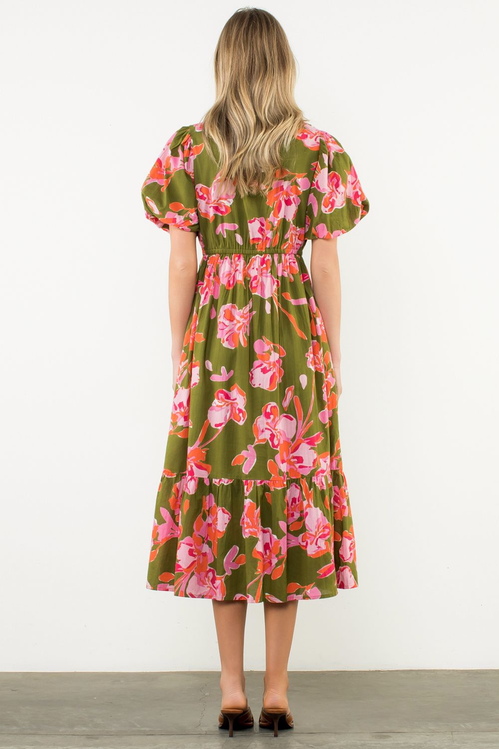 Elevate your wardrobe with this sophisticated Puff Sleeve Flower Print Dress, featuring a vibrant green base adorned with delicate pink flowers. The chic neck detail adds a refined touch, perfect for accentuating your neckline. Its elegant puff sleeves blend classic charm with modern style, making it an impeccable choice for any upscale occasion.