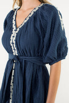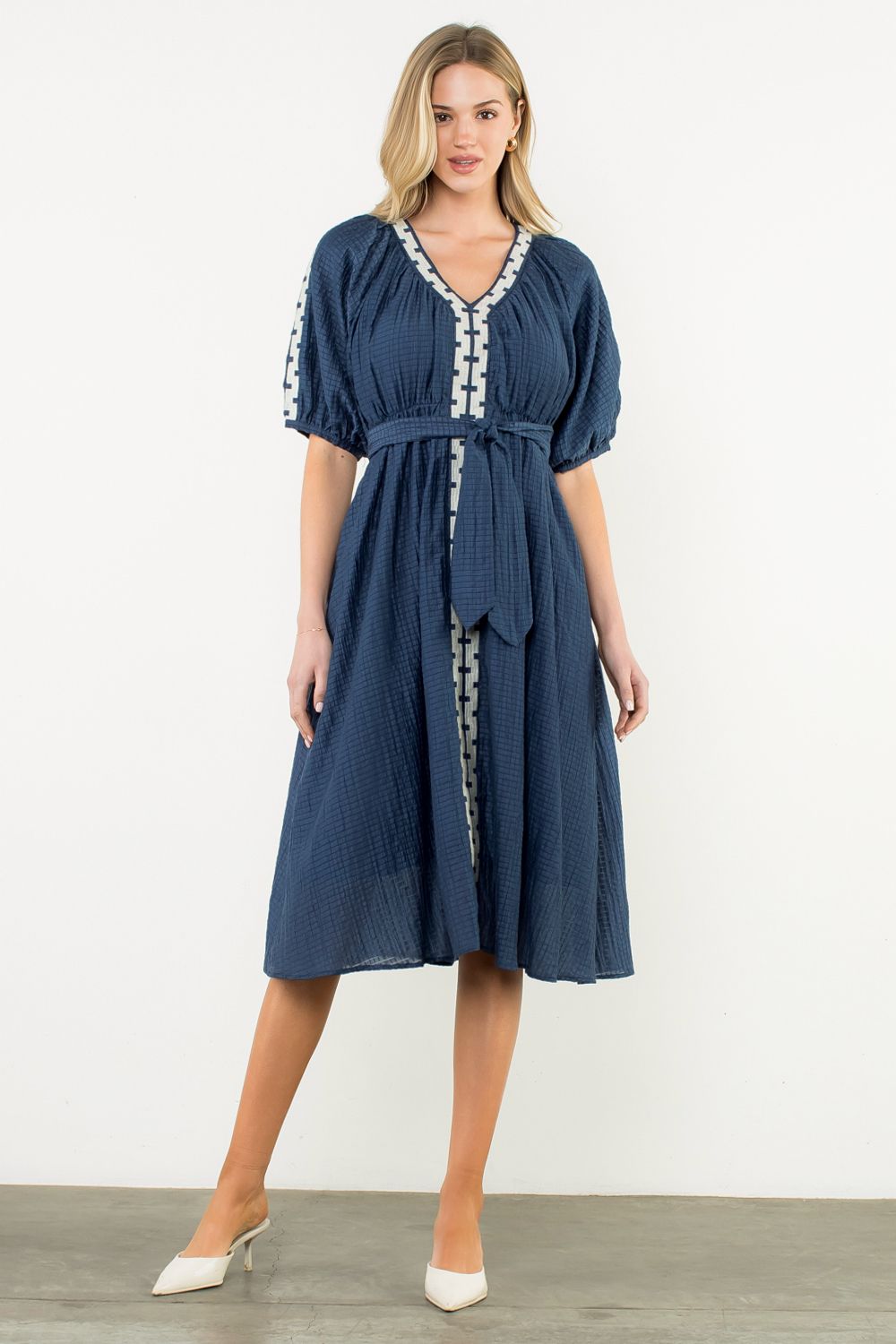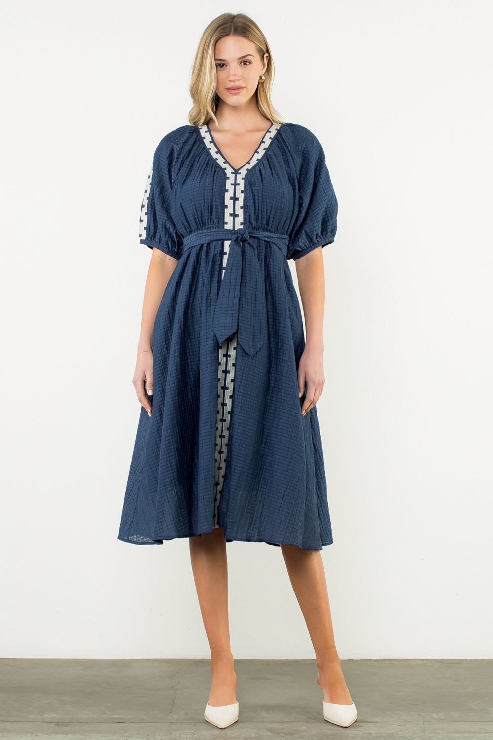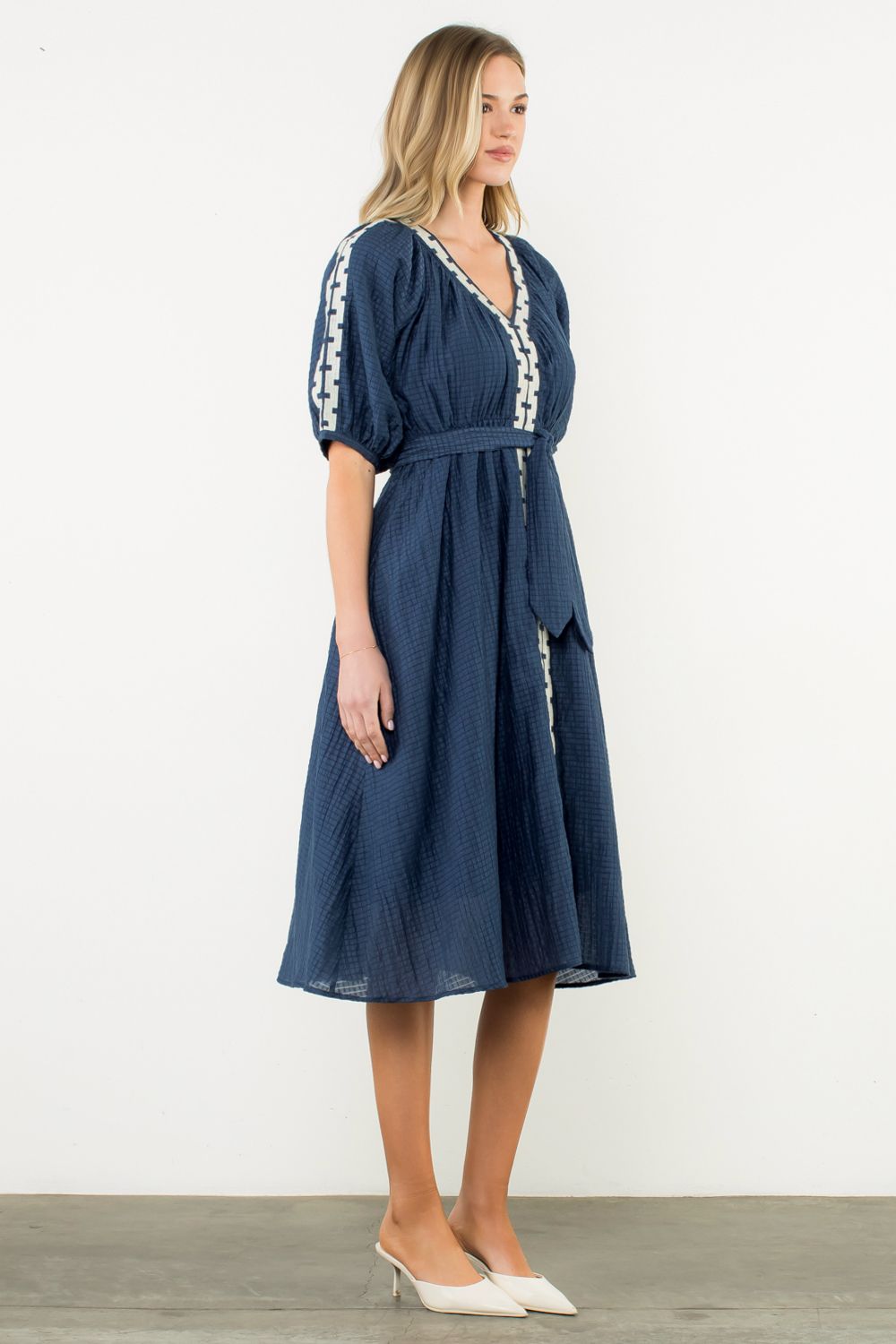 A breezy midi dress designed with a textured finish and elegant embroidery along the neckline and front. Featuring puff sleeves and a flattering tie waist, it offers both comfort and style for everyday wear. The flowy silhouette moves beautifully, making it perfect for casual outings or relaxed gatherings. Timeless and versatile, it’s an effortless addition to any wardrobe.
