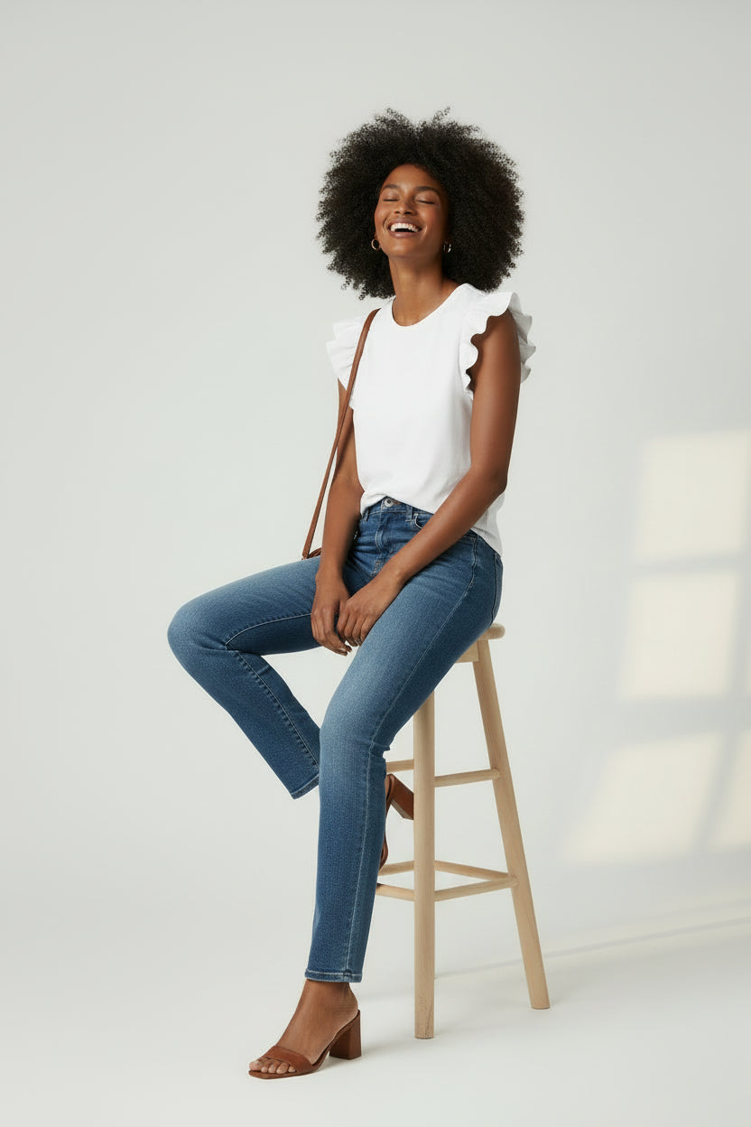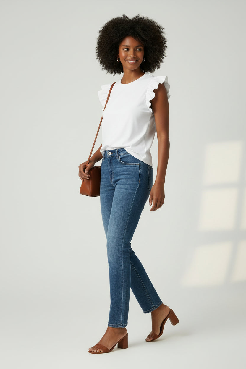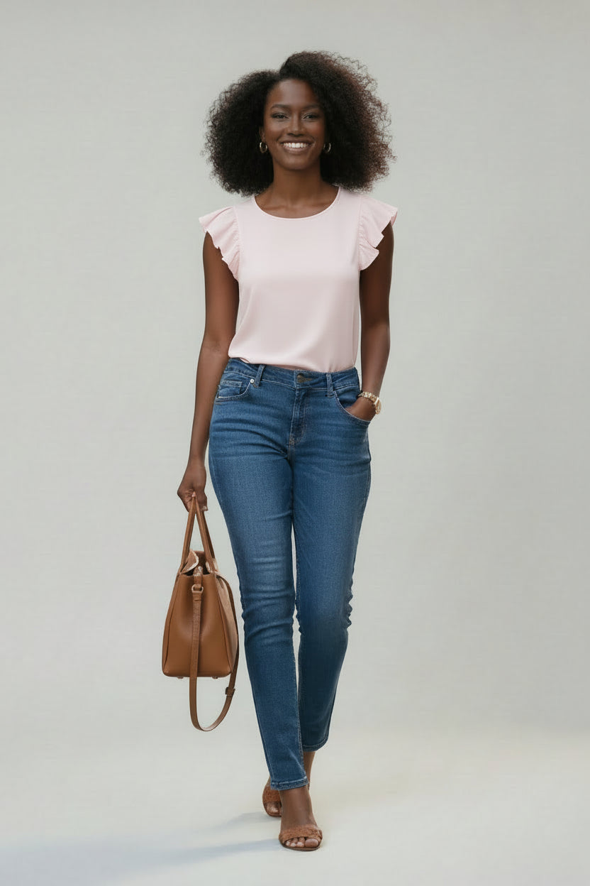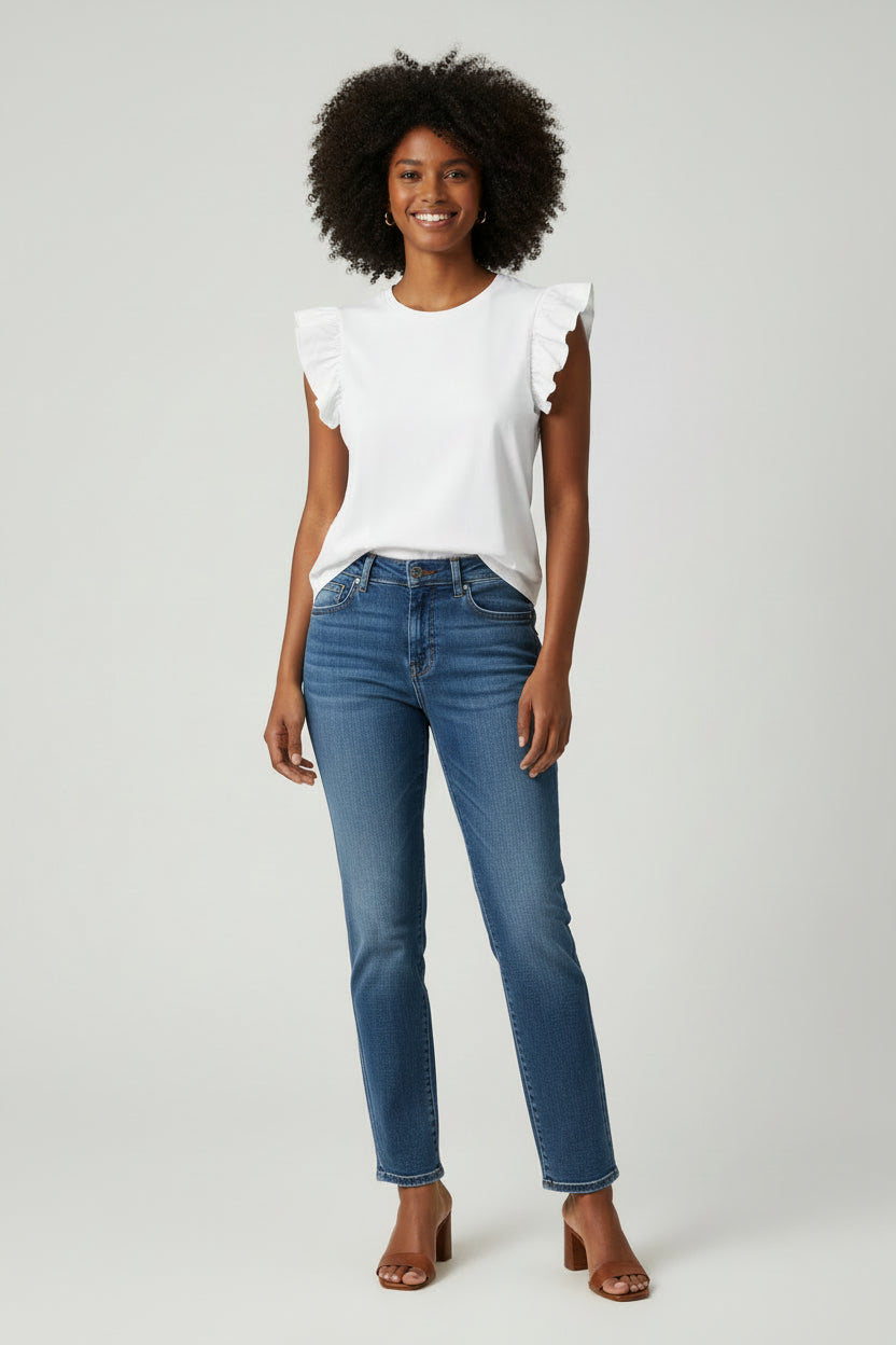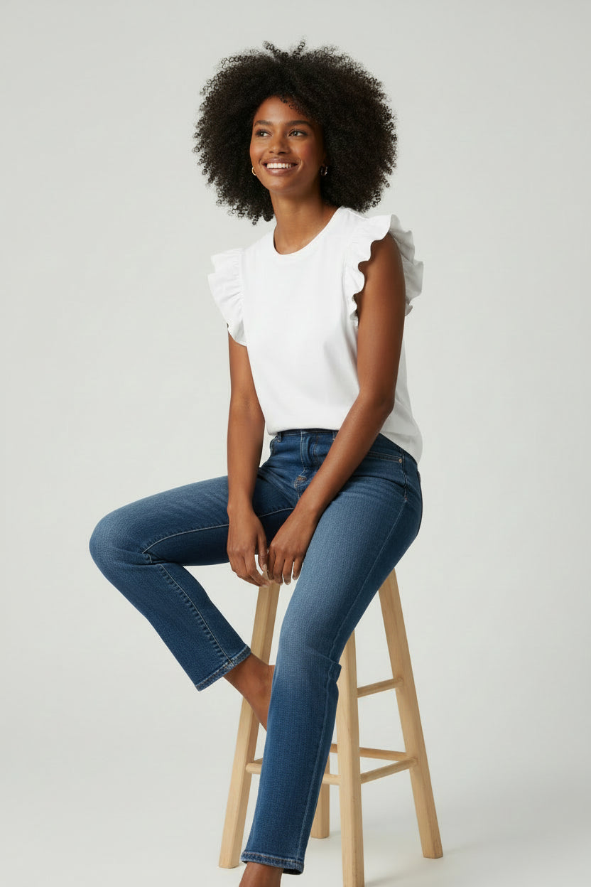Elevate your everyday essentials with this feminine and versatile sleeveless top, featuring playful ruffled flutter sleeves that add movement and soft texture. Its clean design makes it an ideal staple for effortless layering or wearing on its own for a polished, modern look. The classic round neckline provides a timeless profile, while the solid-color, sleeveless design offers versatility for easy pairing with denim or tailored skirts. Crafted with a smooth finish and a straight hemline for a comfortable, streamlined fit.