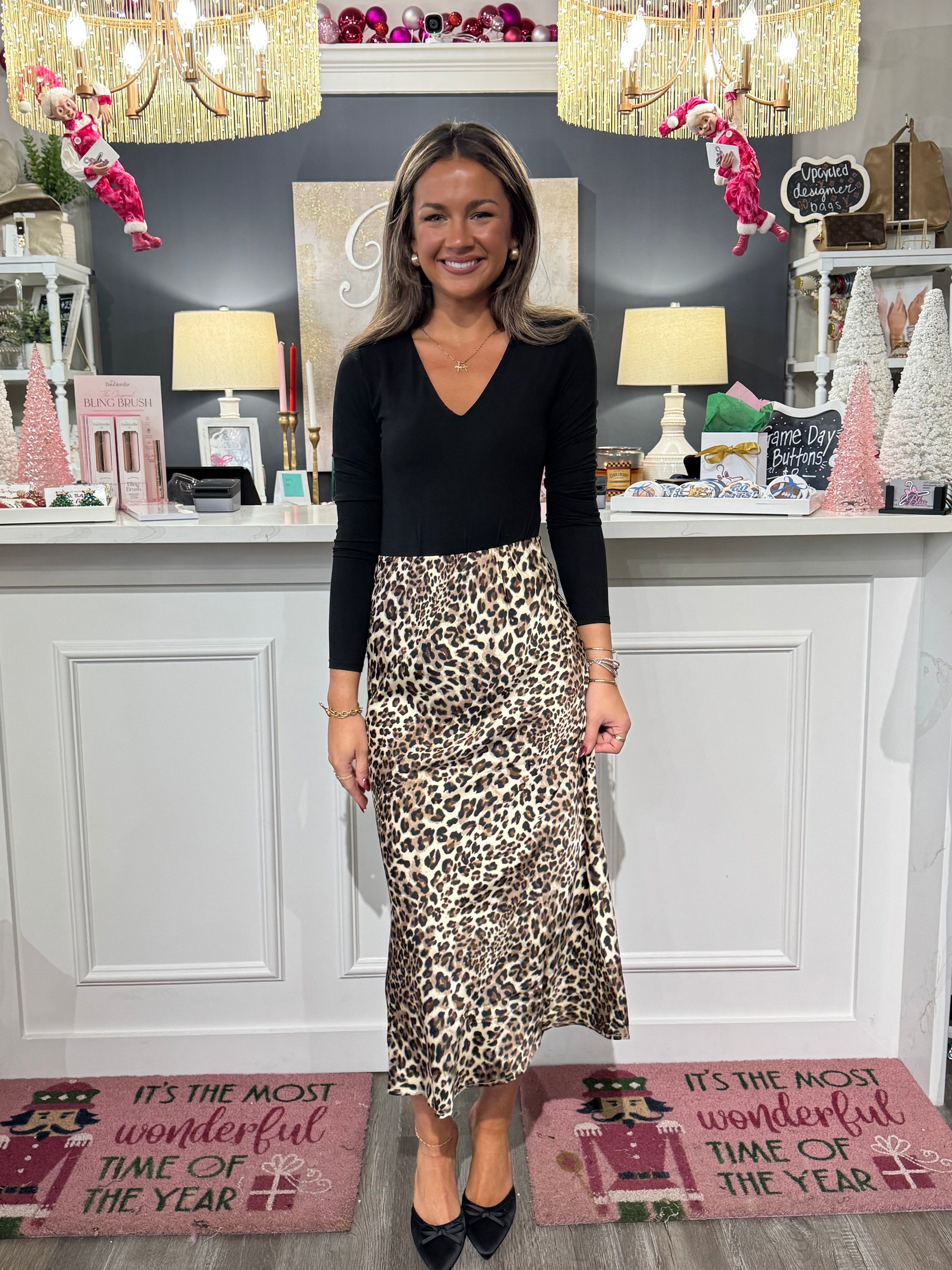 Add a fierce touch to your wardrobe with the Satin Midi Skirt by &Merci. Featuring a trendy leopard print, this skirt is sure to make a statement. Embrace your wild side and elevate any outfit with this must-have piece. (Meow!)