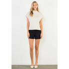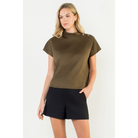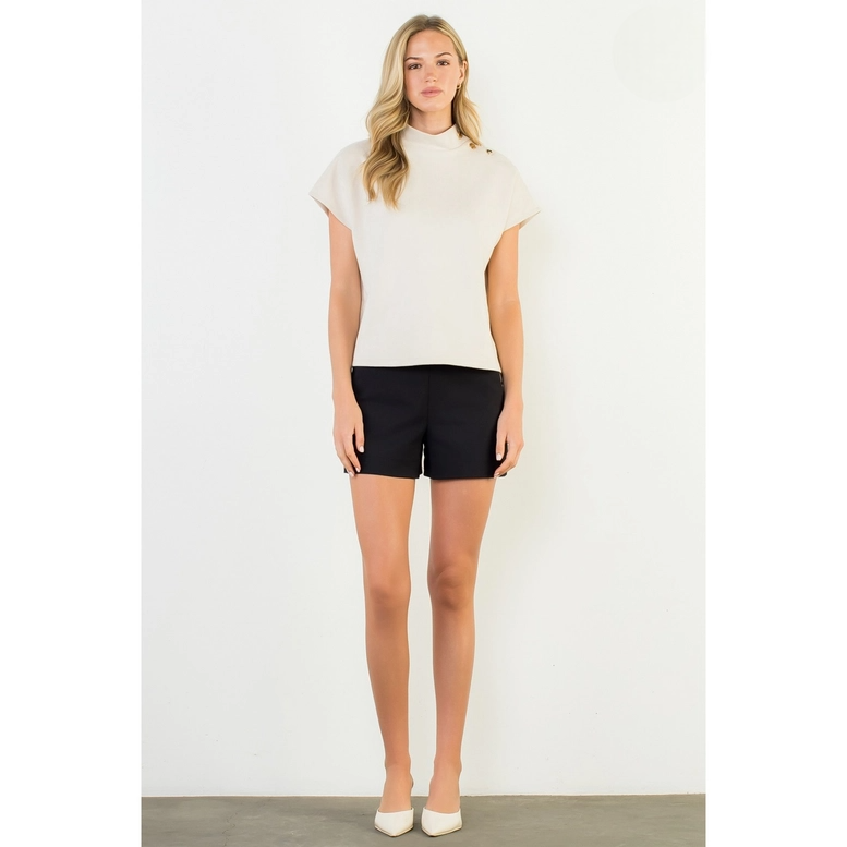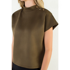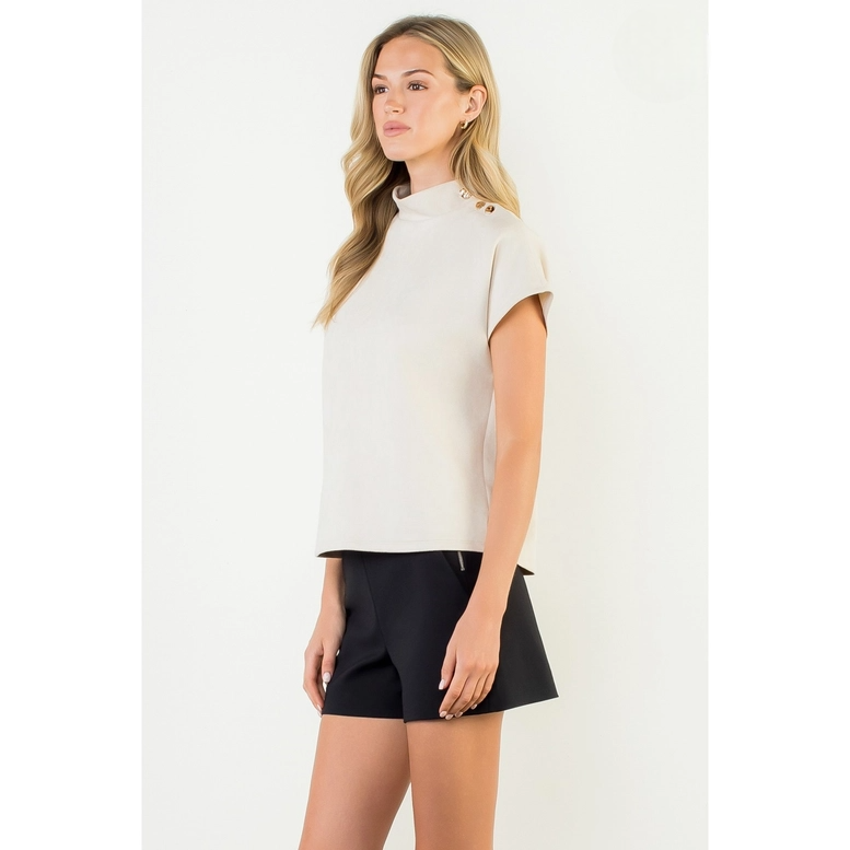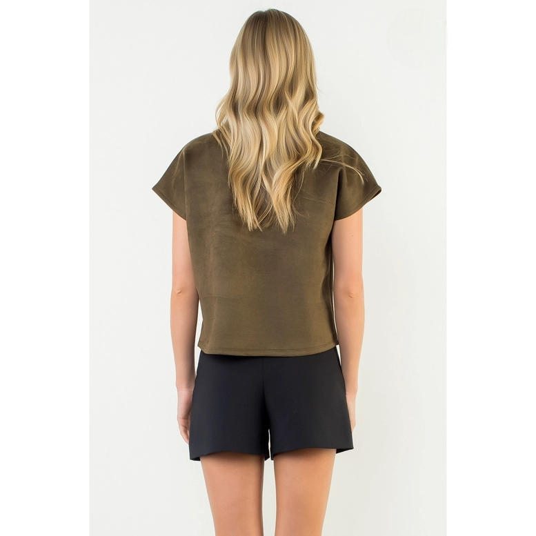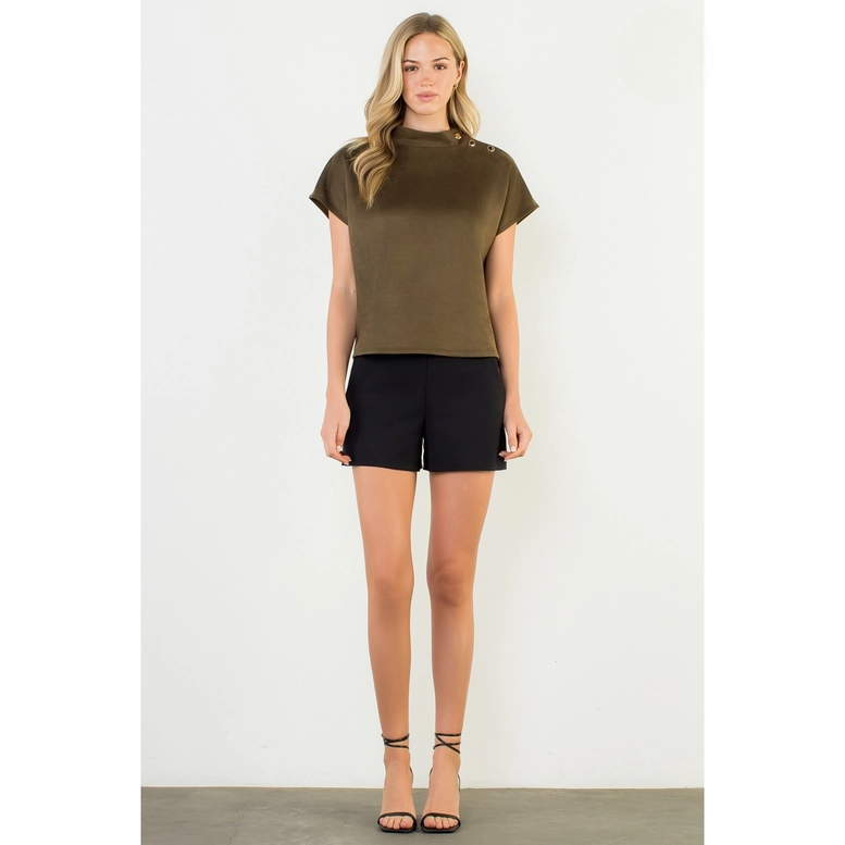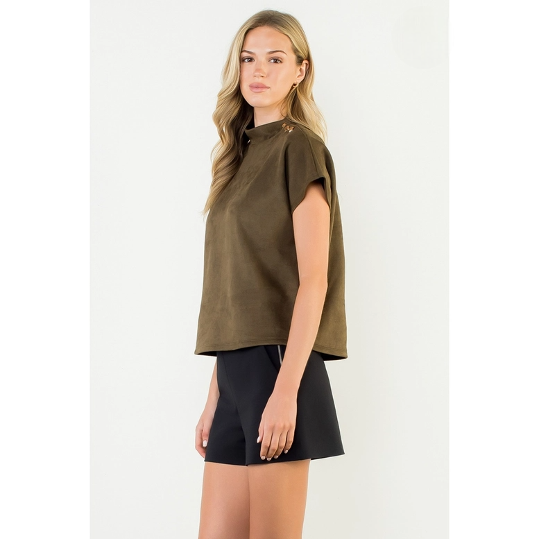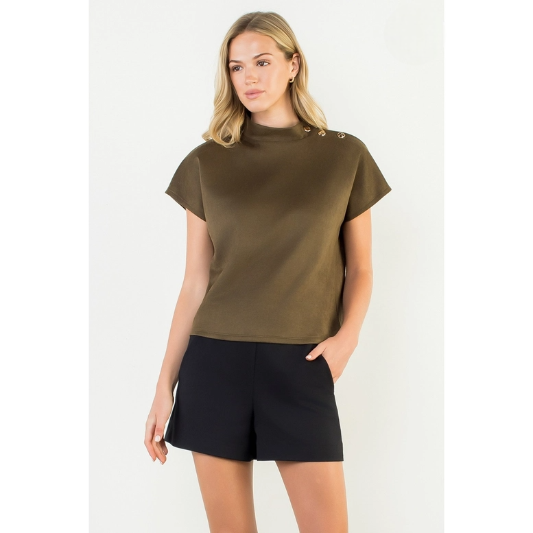 This sleek short sleeve top features a soft, suede-like finish that adds a touch of sophistication to any look. Designed with a high neckline and chic button details at the shoulder, it brings subtle elegance with modern appeal. The relaxed fit makes it comfortable for all-day wear, while the versatile style pairs effortlessly with both casual and dressy bottoms. Perfect for transitioning from work to evening outings with ease.