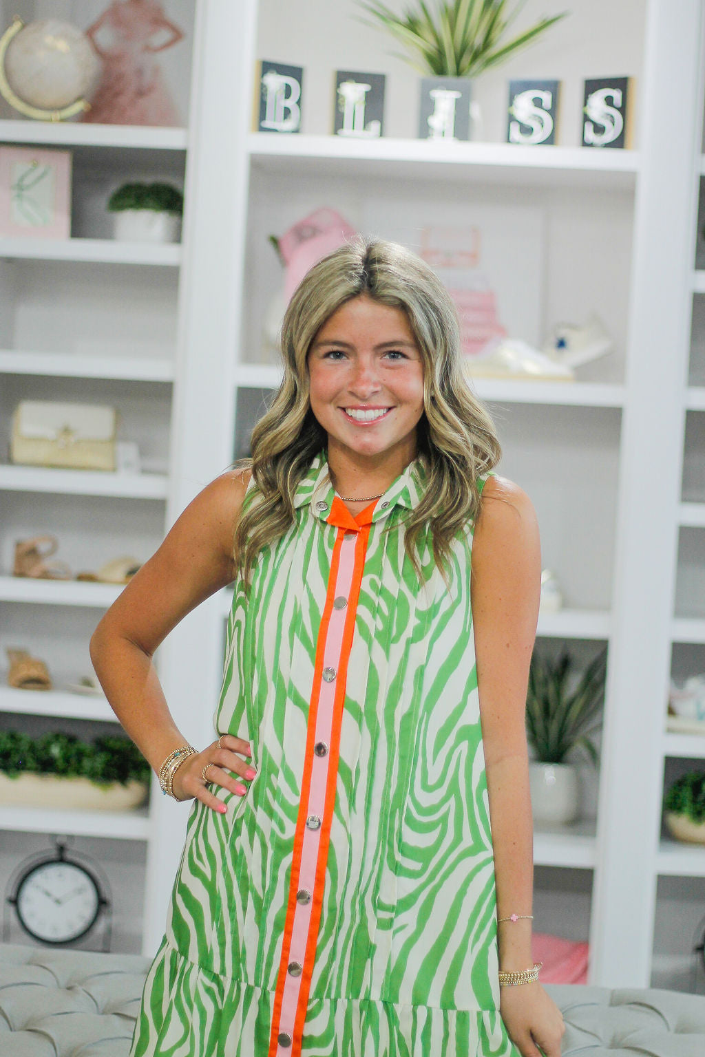 Unleash your wild side in this playful Sleeveless Lime Green Zebra Dress! Its bold button-up design will make you stand out in any crowd. No need to take yourself too seriously with this quirky and fun dress. (Warning: may cause excessive compliments and head-turning.)