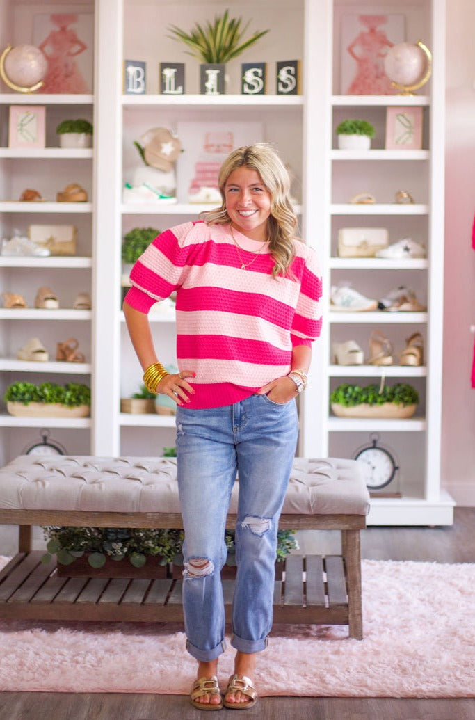 Don't be afraid to embrace your love for pink with the So Much Pink Sweater. This short sleeve sweater features a playful mix of light and dark pink stripes in a textured knit. Not only is it super comfy, but its lightweight design makes it perfect for every season.