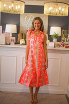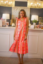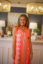 Stay stylish and comfortable all day long in this THML tie strap dress. Featuring a bright and bold pink and orange pattern, this dress is perfect for any occasion. Made with high-quality materials, it offers both fashion and durability. Upgrade your closet with this must-have piece.