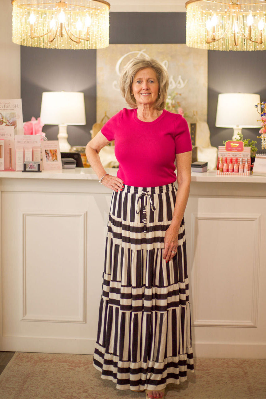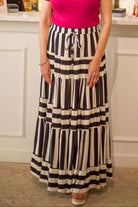 Get ready to add some fun to your wardrobe with our Stripe Tiered Maxi Skirt! The colorful stripes and tiered design make it perfect for dressing up or down. Plus, pair it with a cute top for a pop of color!