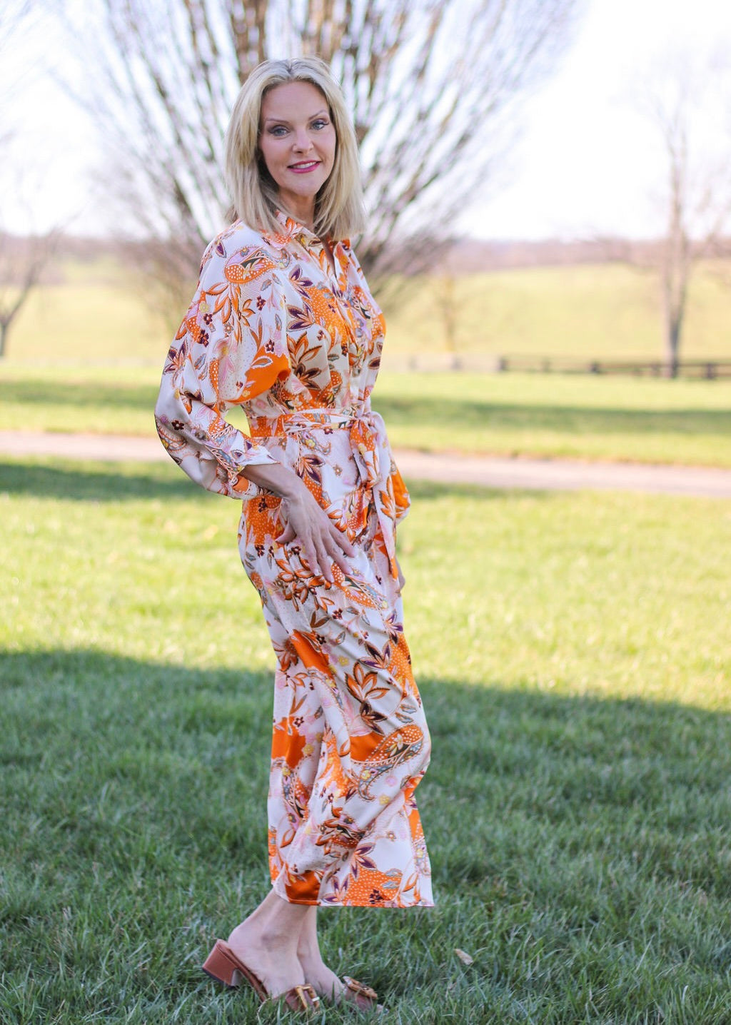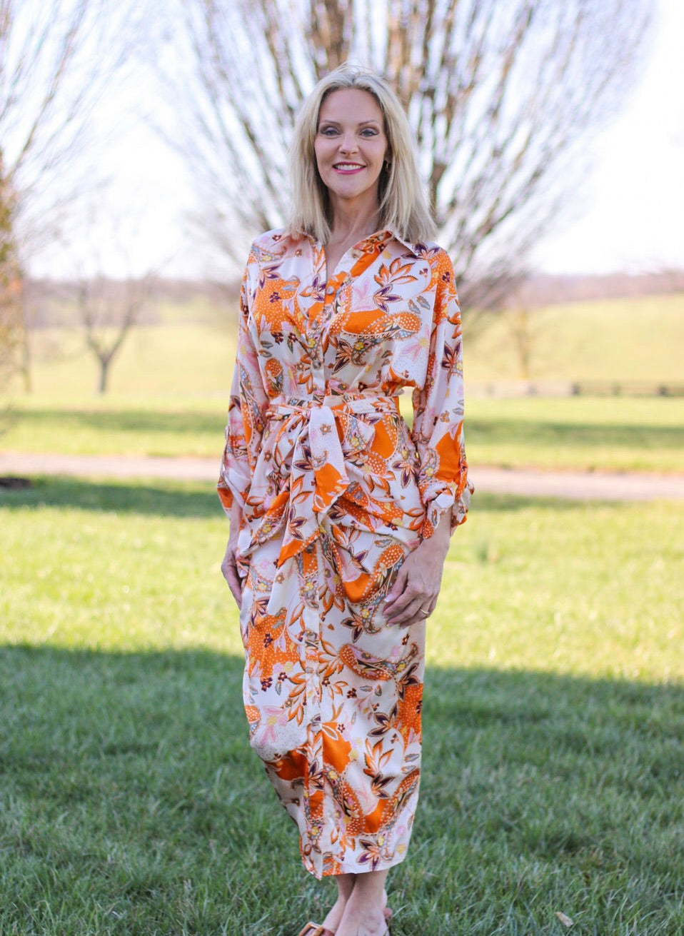 Elevate your wardrobe with the Sunrise Serenade Midi Dress. Crafted from 100% polyester. The belted waist adds a flattering touch while the button-down front adds a sophisticated touch. Perfect for any occasion, this dress is a must-have for any fashion-forward individual.