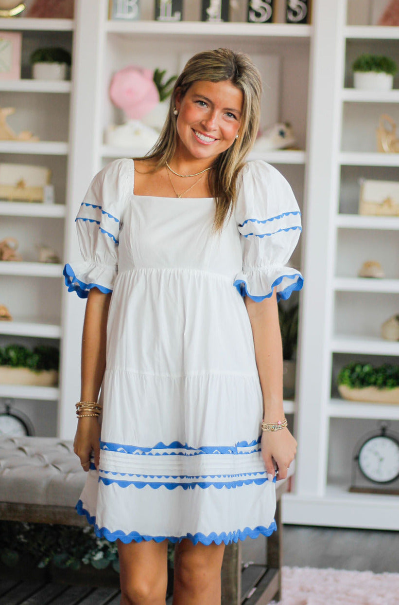 Crafted with a charming white fabric accented by delicate blue ric rac trim and pintuck detailing, the Suzanne Dress is the perfect mix of playful and sophisticated. Its cute, short design features puffed sleeves, making it a stylish addition to any wardrobe.
