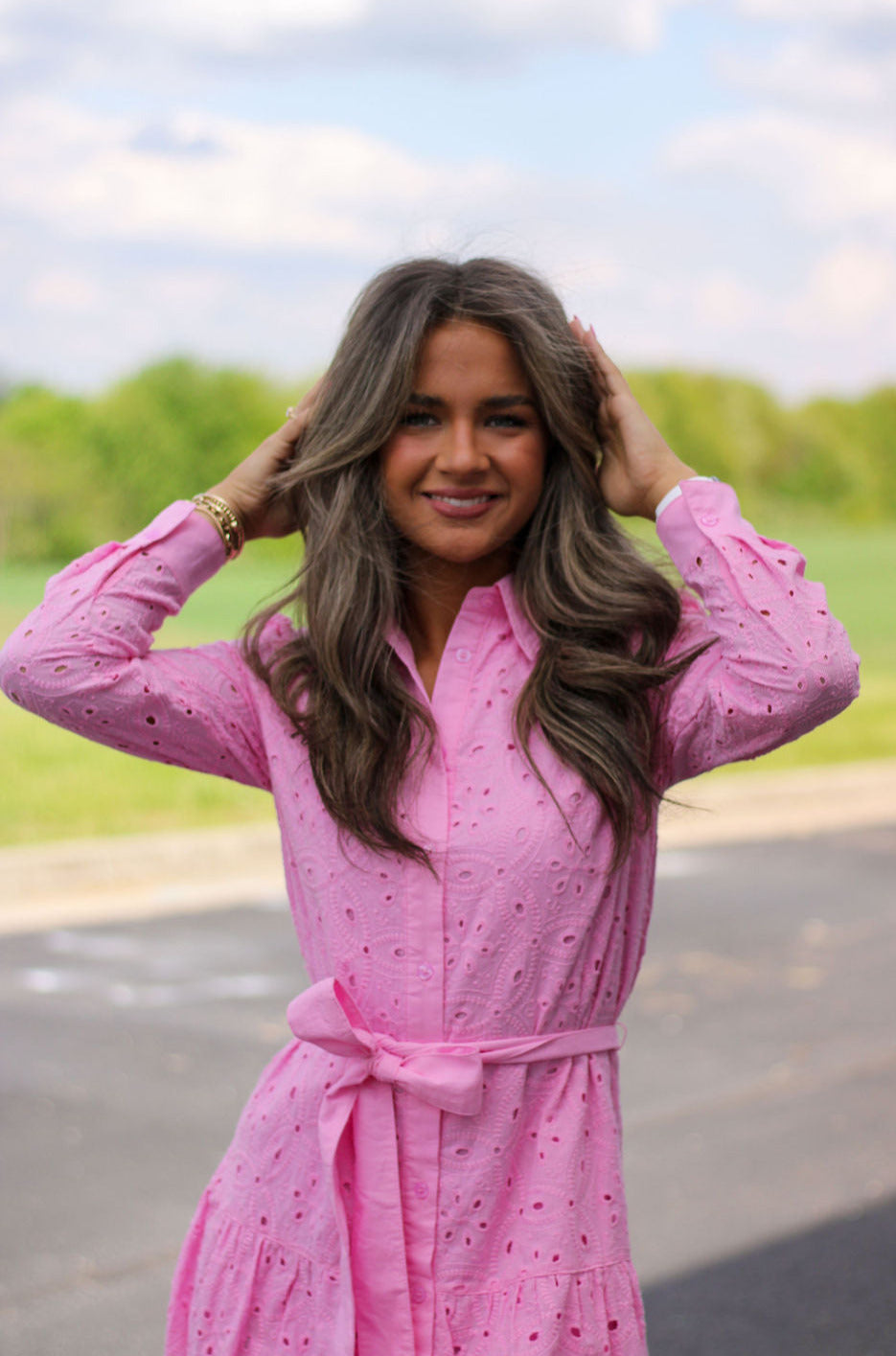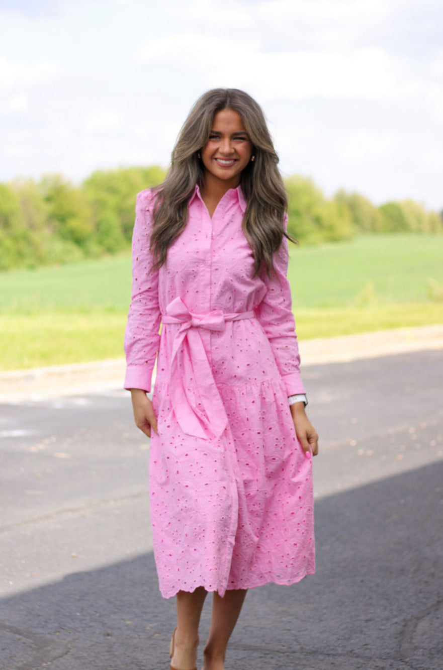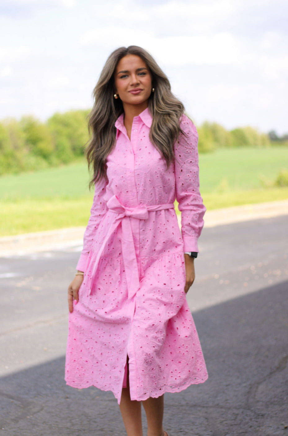 This elegant pink dress features long sleeves and a midi length, perfect for any occasion. Crafted from eyelet material, it offers a feminine touch while the tie around the waist cinches your figure. Complete with a collared neckline and button down front, this dress is a timeless addition to your wardrobe.
