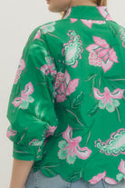 This vibrant floral top combines bold colors with a chic, relaxed fit. The loose, billowy sleeves add a playful touch, while the scalloped hem enhances the feminine appeal. The bright green and pink floral pattern is eye-catching and perfect for casual outings or summer events. Pair it with jeans or skirts for a fresh, stylish look.