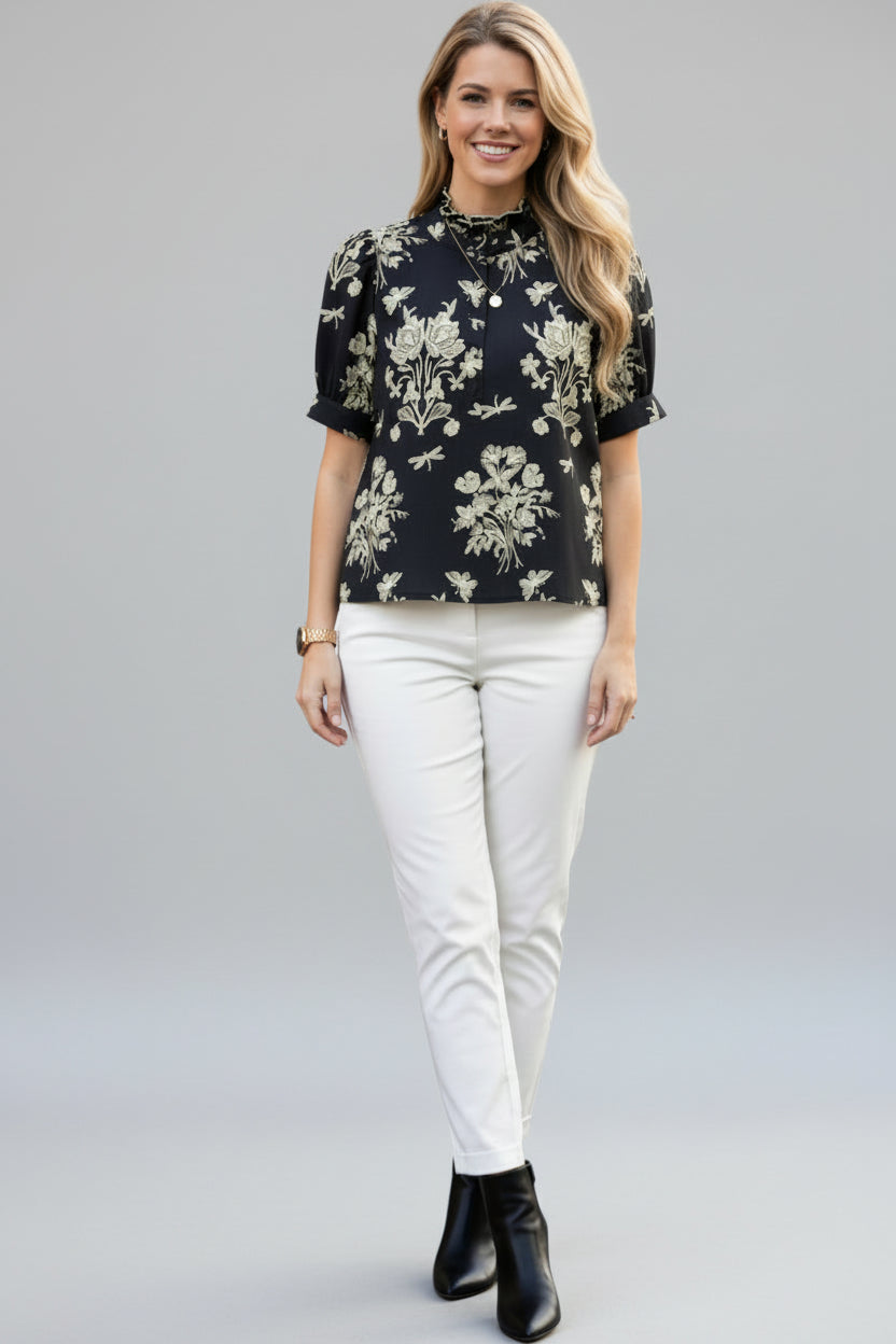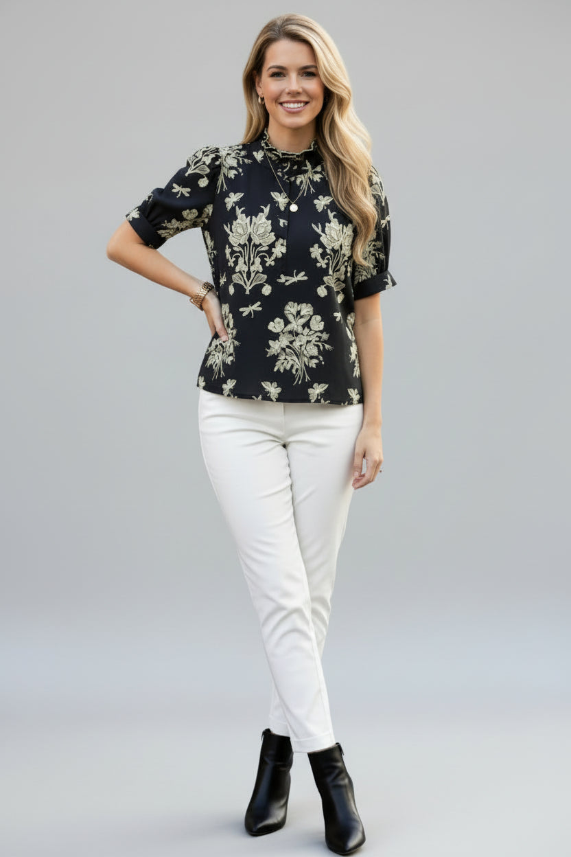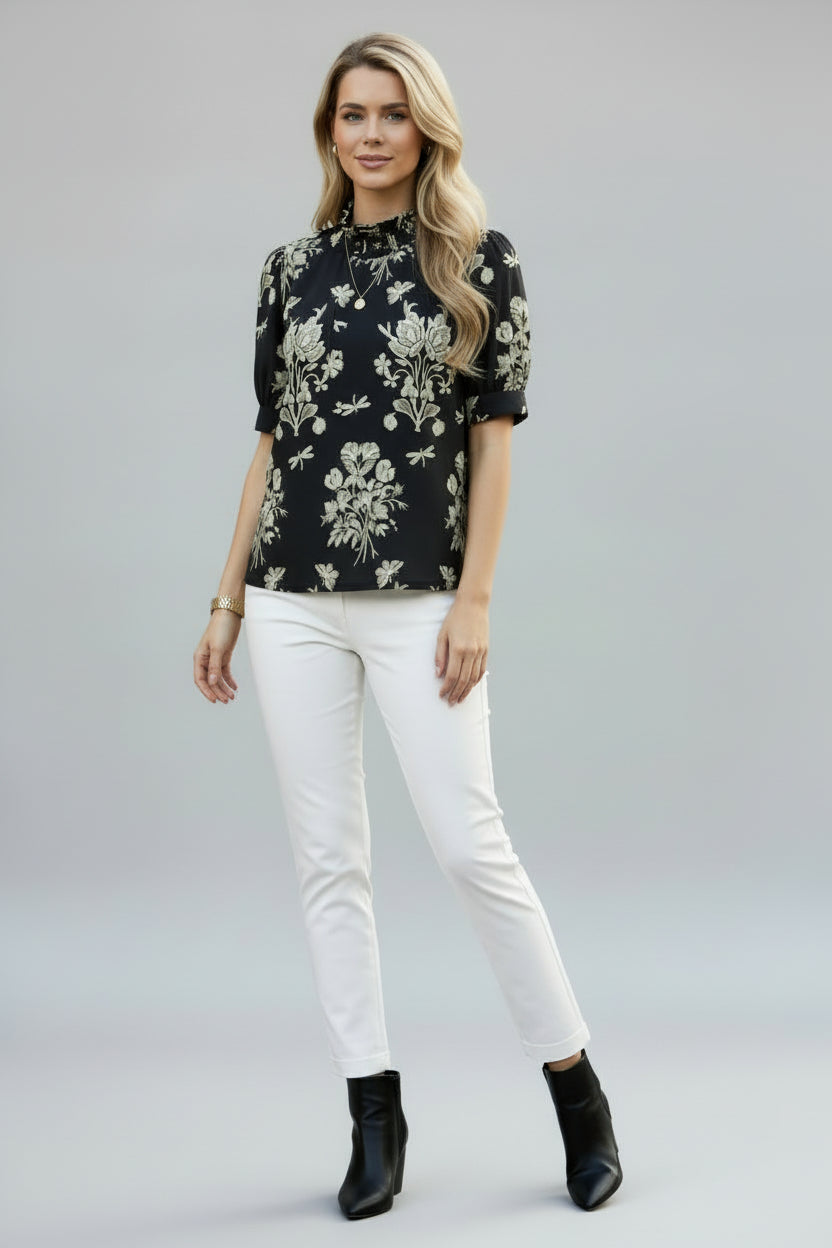 This elegant blouse features intricate floral detailing with a high collar and puff sleeves, offering a timeless look that’s perfect for both casual and semi-formal occasions. The soft fabric provides a comfortable fit, while the stylish design elevates any outfit. A versatile piece that pairs effortlessly with both skirts and pants. Ideal for adding a touch of sophistication to your wardrobe.