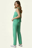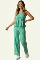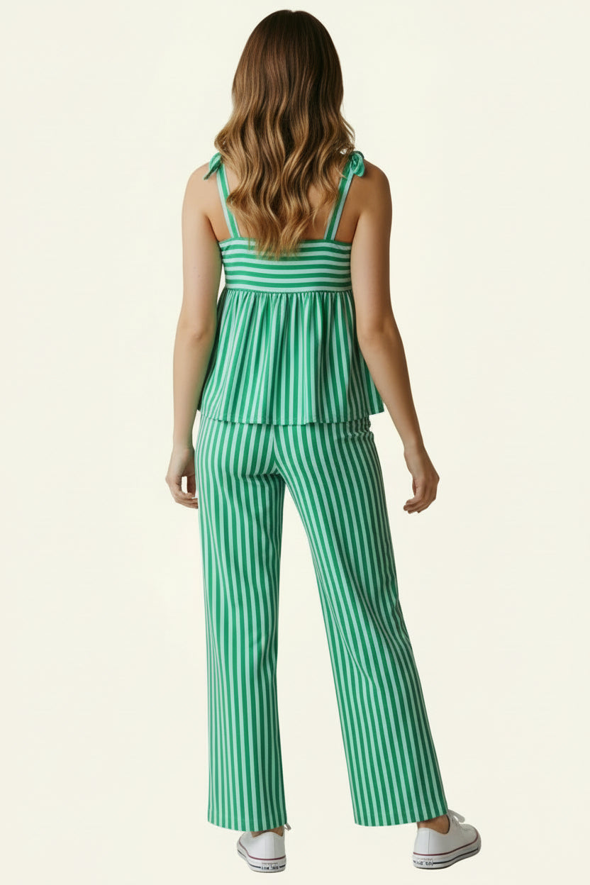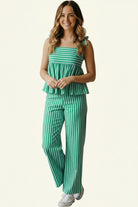 This peplum-style top features playful green and white stripes with adjustable tie straps for a customizable fit. The light, airy fabric adds comfort, making it a perfect choice for warm days. Ideal for casual outings or weekend get-togethers, this top pairs effortlessly with skirts, shorts, or wide-leg pants. The relaxed fit and feminine ruffle detail create a flattering silhouette.
