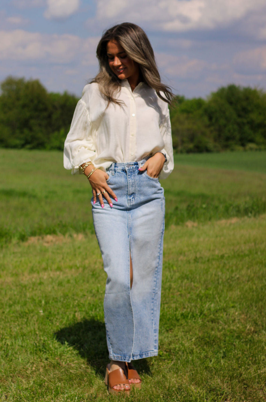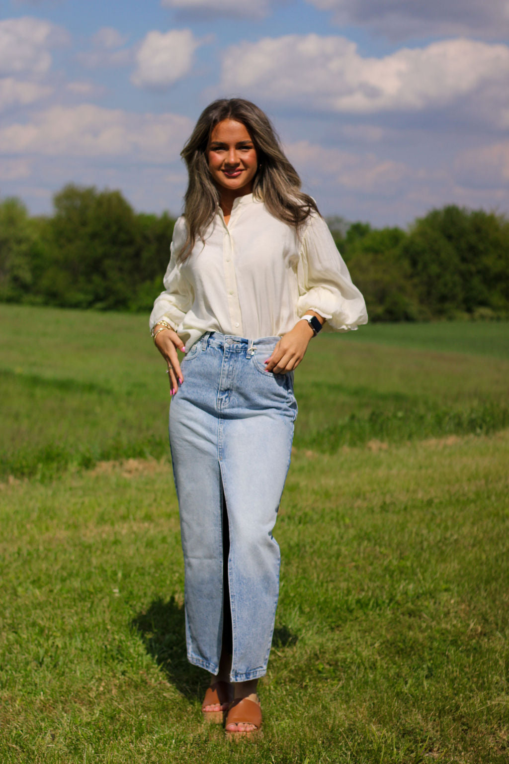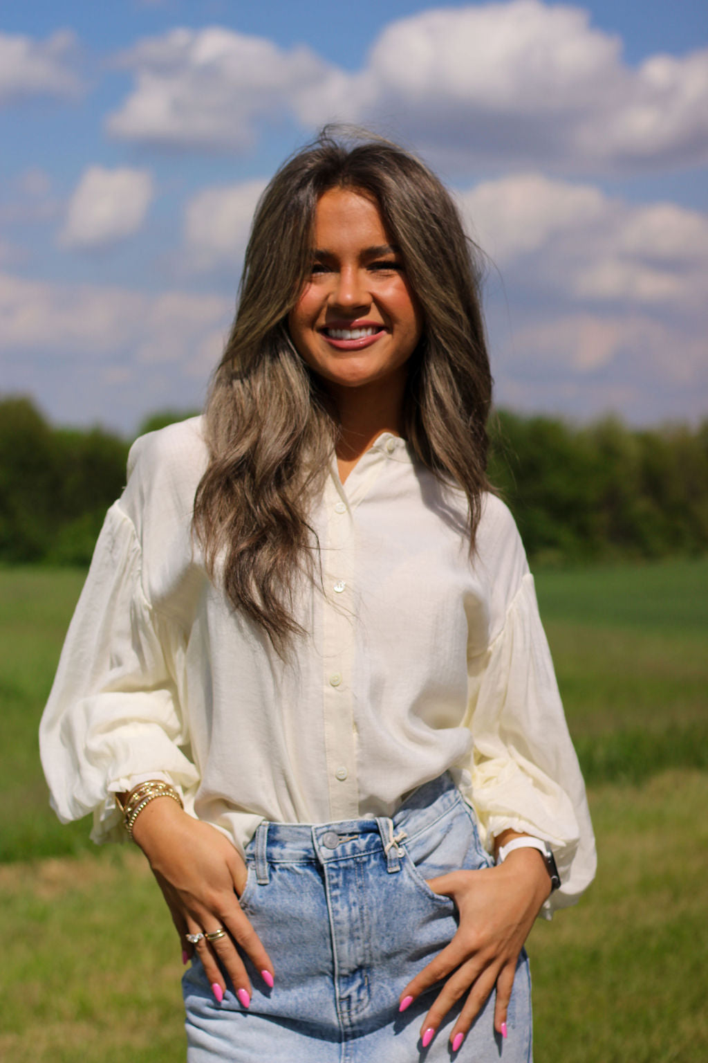 This versatile Through The Wind Top features a cream button down design, with puff long sleeves and high-quality fabric for timeless style. Dress it up or down with ease, making it a must-have addition to your wardrobe.