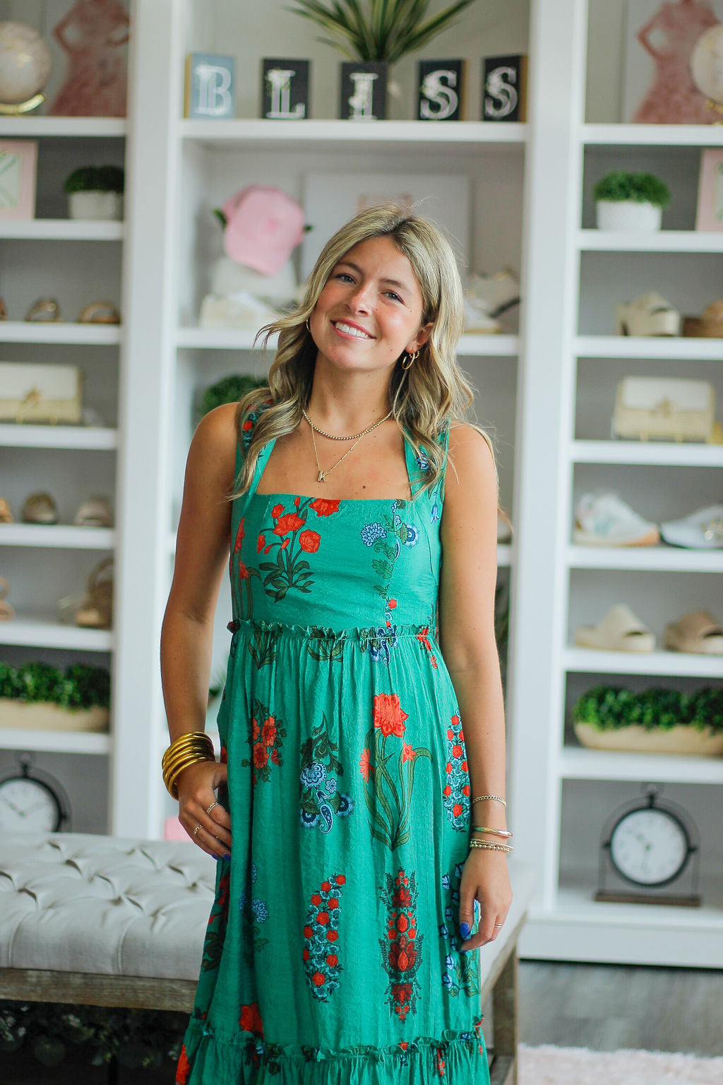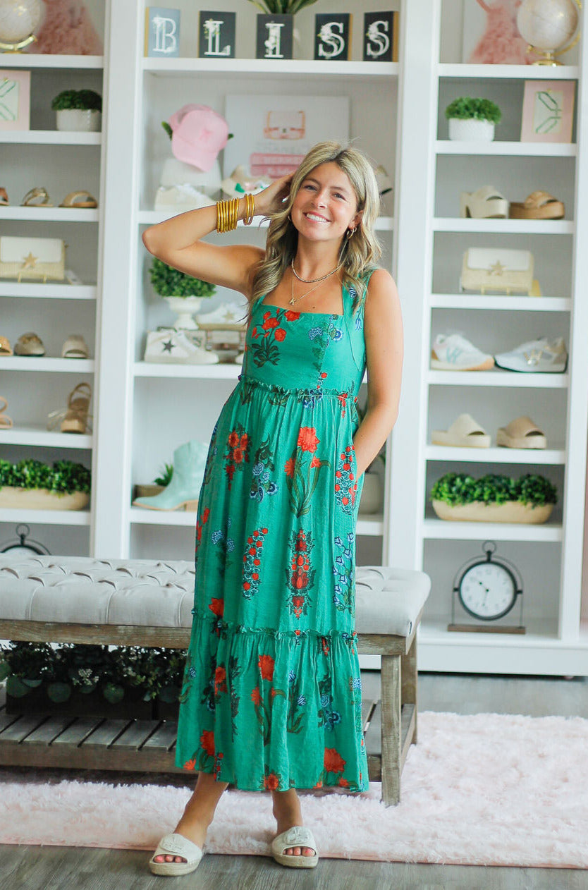Get flower-powered with this tiered green midi dress! Perfect for any occasion, this dress will have you looking and feeling fabulous. The unique tiered design and vibrant flower print make for a playful and stylish statement piece. Get ready to turn heads and bloom with confidence!