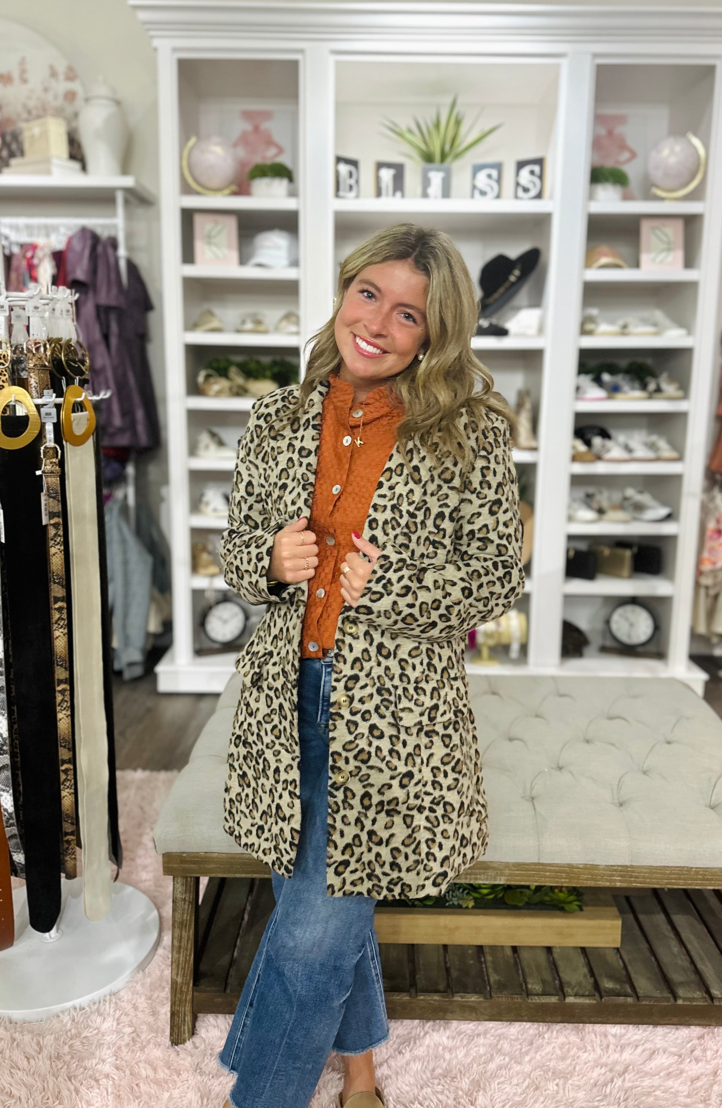Roar into the cooler months with this must-have Leopard Print Double Button Blazer! Crafted with a perfect weight and mid length, this stylish jacket is perfect for fall and winter. Make a fierce fashion statement with this oh-so-trendy blazer.