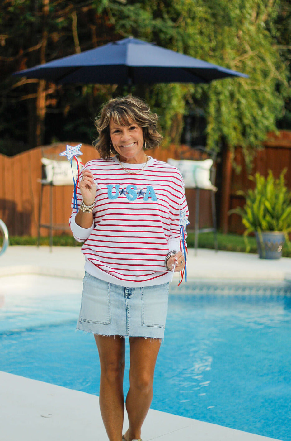 Unleash your patriotic spirit with our "USA" Sweatshirt. Made from a lightweight cotton blend, this breathable piece is perfect for lounging at home or celebrating this summer. Soft toothbrush embroidery, sparkly sequins stars, and a striped design add fun and flair to this comfortable sweatshirt. Show off your love for the country in style.
