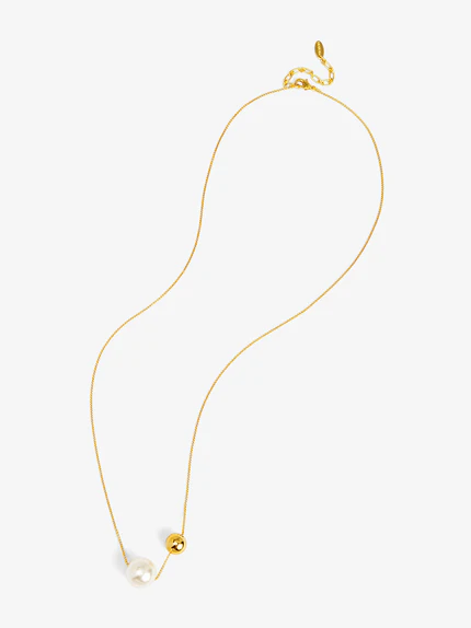 Add a touch of whimsy to your look with this playful Pearl and Gold Plated Ball Necklace. Featuring a long, gleaming gold box chain, it showcases a large, lustrous round pearl paired with a slightly smaller shiny gold ball. This charming combo brings a fun twist to classic elegance, perfect for brightening any outfit with a dash of sparkle and personality.