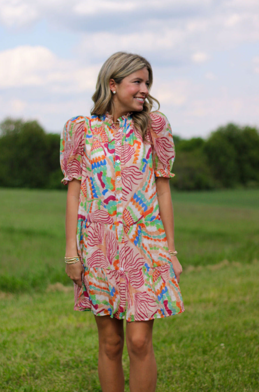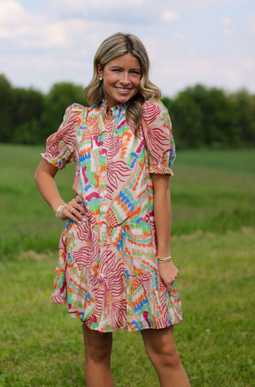 Expertly crafted, the Work Of Art Dress is an abstract printed, button down dress. Its half puffed sleeves and ruffled hem add a touch of flair to this short and super cute dress. Perfect for any occasion, this dress is sure to make you stand out.